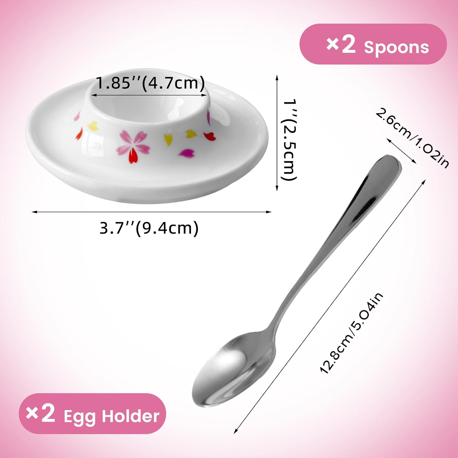 Cinf Ceramic Sakura Egg Holder Set of 2 Porcelain Holder With 2 Stainless Steels Egg Spoons Breakfast Boiled Cooking Easy to Clean Childhood Memories Kitchen