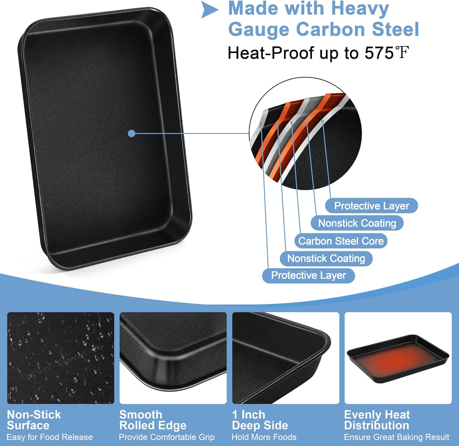 - Carbon Steel Toaster Oven Pan: The excellent heat conductivity of carbon steel small baking pan transferred heat quickly and evenly, Ensuring great cooking results for the food, Smooth edges no sharp spots, Offers a secure and comfortable hold, 1 inch deep rim to hold more food and avoid food juice spilling out, Keeps your oven clean