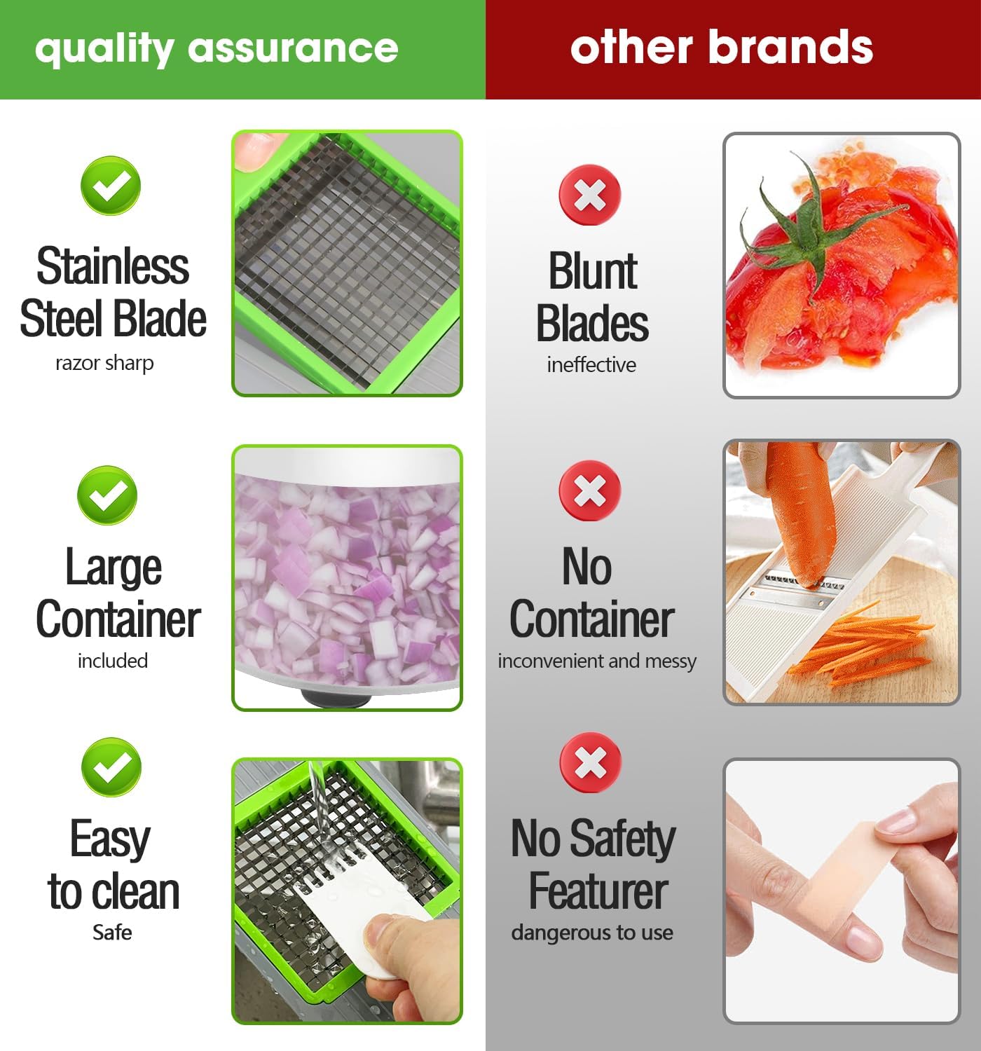 - High Quality - The Vegetable Chopper Blades Is Made Of 301-Grade Stainless Steel. Onion Chopper Container Made From BPA-Free Professional Grade and Heavy Duty Reinforced Food Grade ABS with Non-Skid Rubber Base.