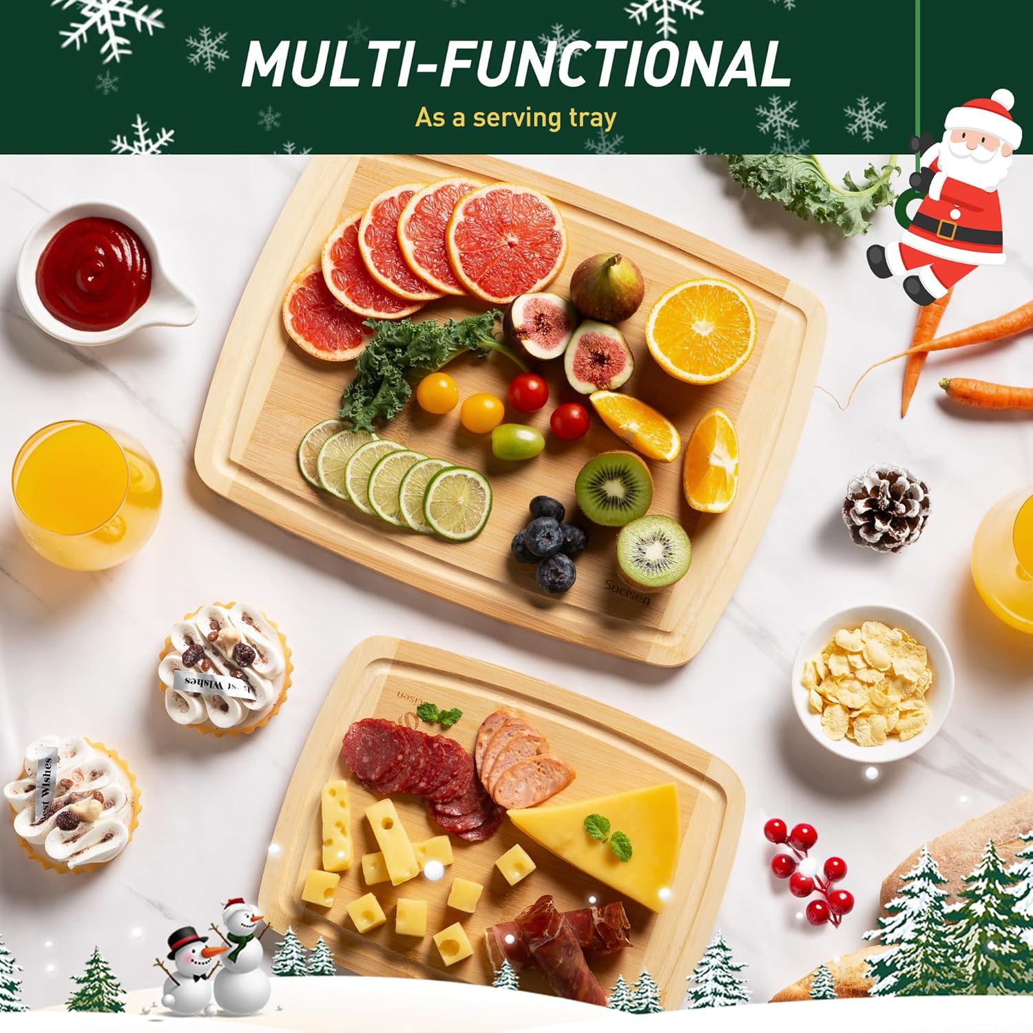 - Two Perfectly Sized for Versatile Use: Our bamboo cutting board set has two sizes β 11"x8.5", and 14.5"x11". The medium is for quick chopping and larger meal prep, the large for slicing meats or serving. Thoughtfully sized to fit different needs without taking up too much counter space. Whether dicing veggies, slicing fruits, or carving meats, there's a chopping board for every occasion. Perfect for various kitchen tasks and charcuterie boards.