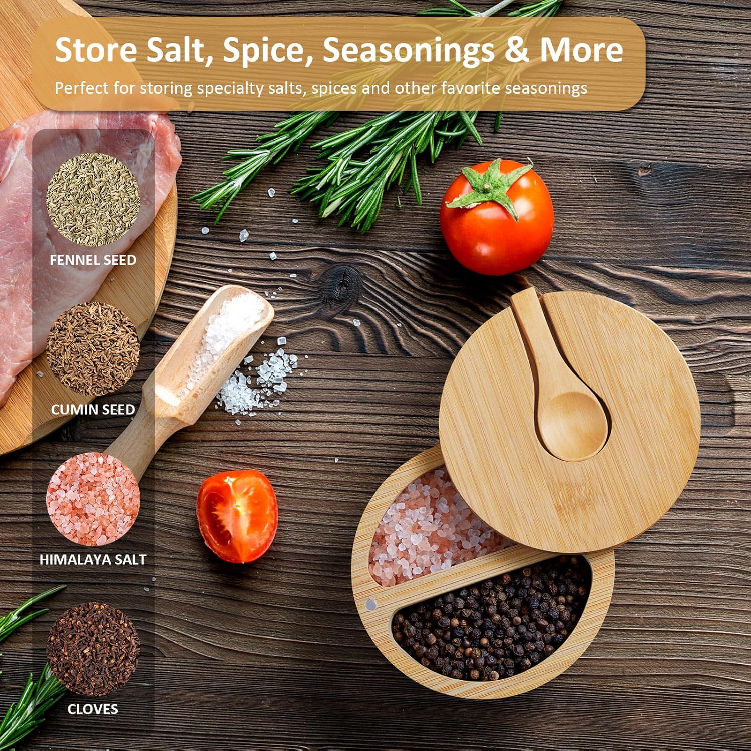 2-Compartment Salt Box with Lid and Spoon, Bamboo Salt Cellar with Swivel Lid, Salt and Pepper Bowls for Salt & Spices, Dual 6 oz Salt Container