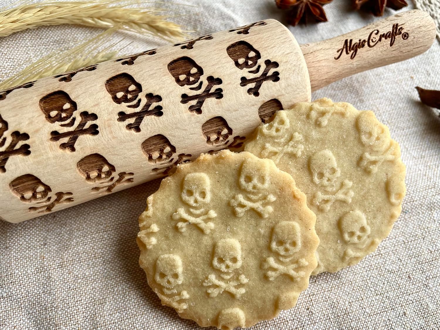 HALLOWEEN 3 Mini Embossed Rolling Pin Set. Wooden Laser Engraved Textured rolling pins for Cookies, Modeline, Ceramic with Skulls, Bats, Halloween by Algis Crafts