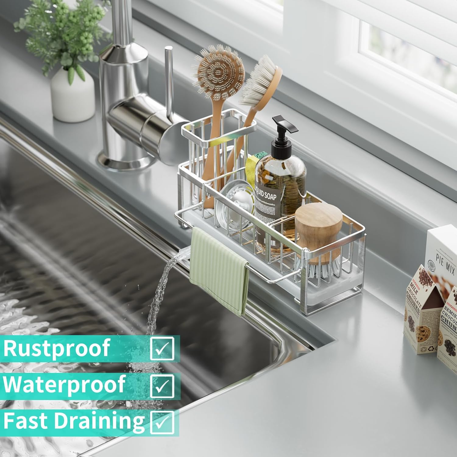 - [Reasonable Size & Support]: The size of our sink organizer is 9.25*4.13*5.12 inches. Our sponge caddy for kitchen sink can meet your daily needs well. If you are not satisfied with this sink caddy kitchen sink organizer, please reach out to us