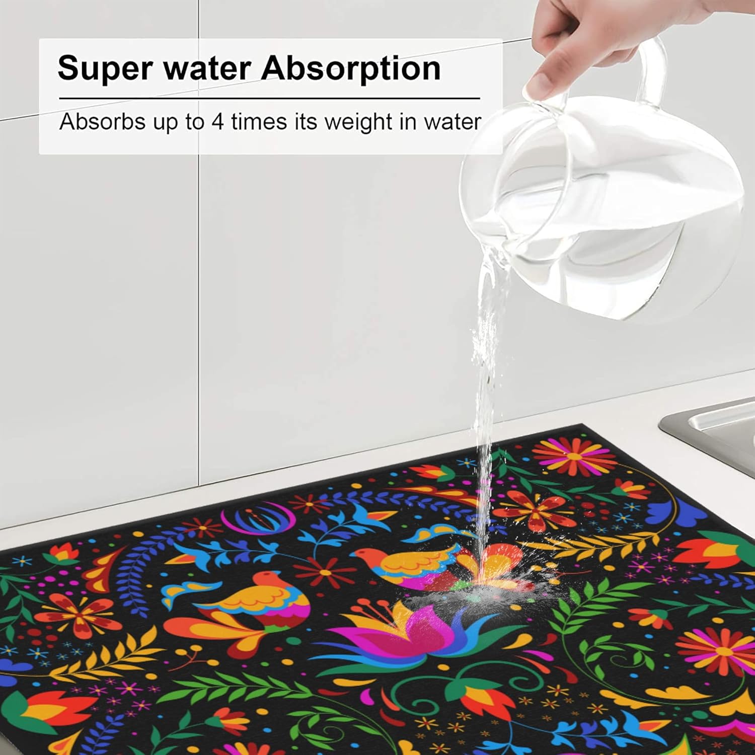 Mexican Dish Drying Mat for Kitchen Counter Mexican Flower Decorative Dish Drainer Rack Mats 16x18 Inch Absorbent Reversible Drying Pad Black