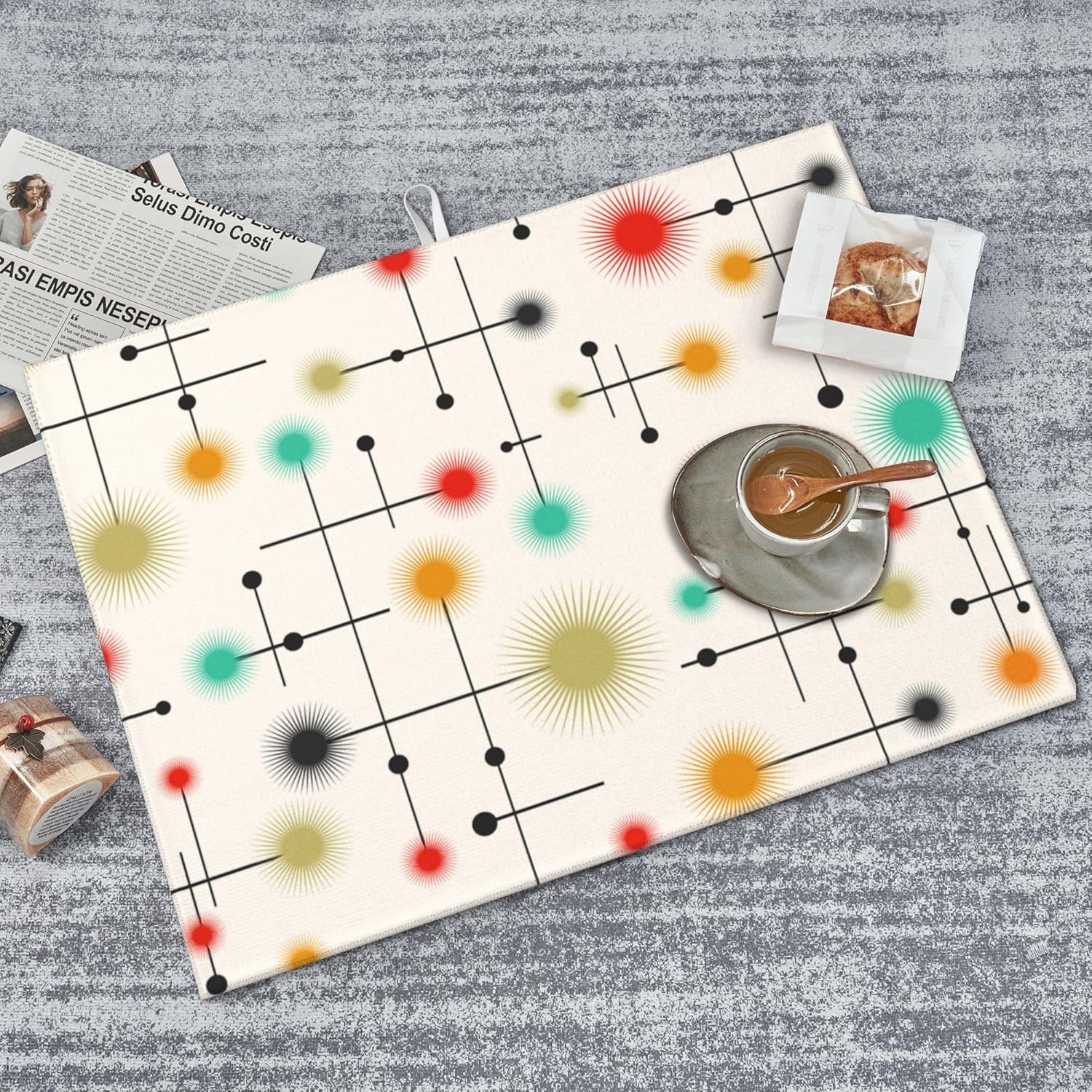 Mid Century Modern Dish Drying Mat for Kitchen Counter Abstract Modern Absorbent Reversible Atomic Retro Drying Pad Yellow Decor Dish Drainer Rack Mats 18"x24"