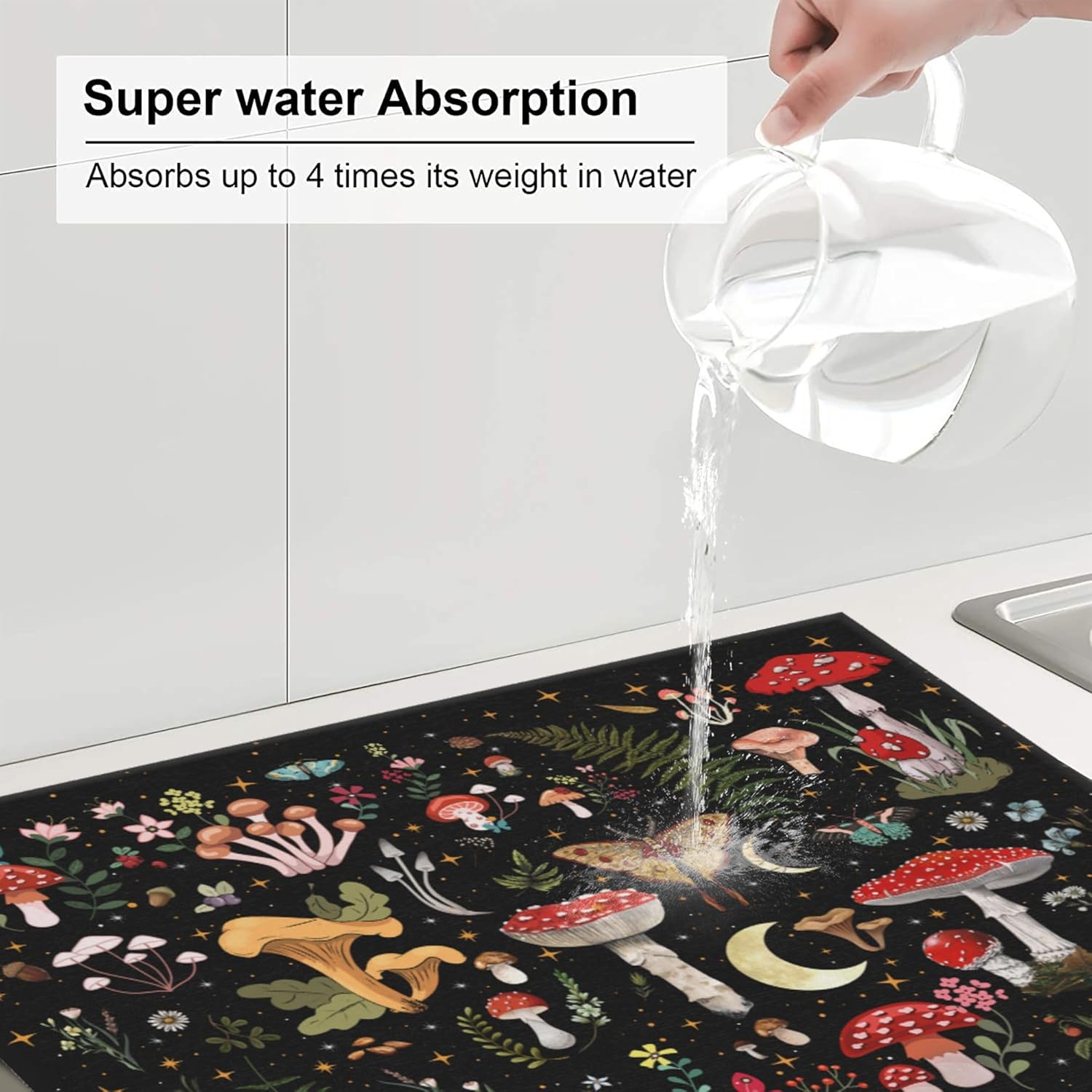 Mushroom Dish Drying Mat for Kitchen Counter Moth Gothic Witchy Dish Drainer Rack Mats 16x18 Inch Absorbent Reversible Black Drying Pad