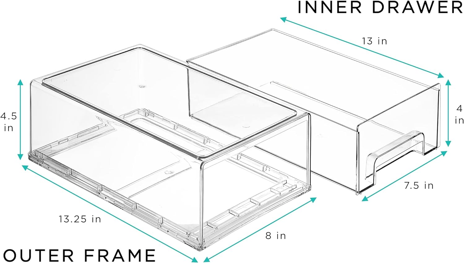 - ✅ Convenient Inner & Outer Sizes for Perfect Fit Each drawer has an inner bin size of approximately [13 x 7.5 x 4] and an outer frame measuring about [13.25 x 8 x 4.5], making these organizers ideal for fitting inside most standard refrigerators, cabinets, or pantry shelves.