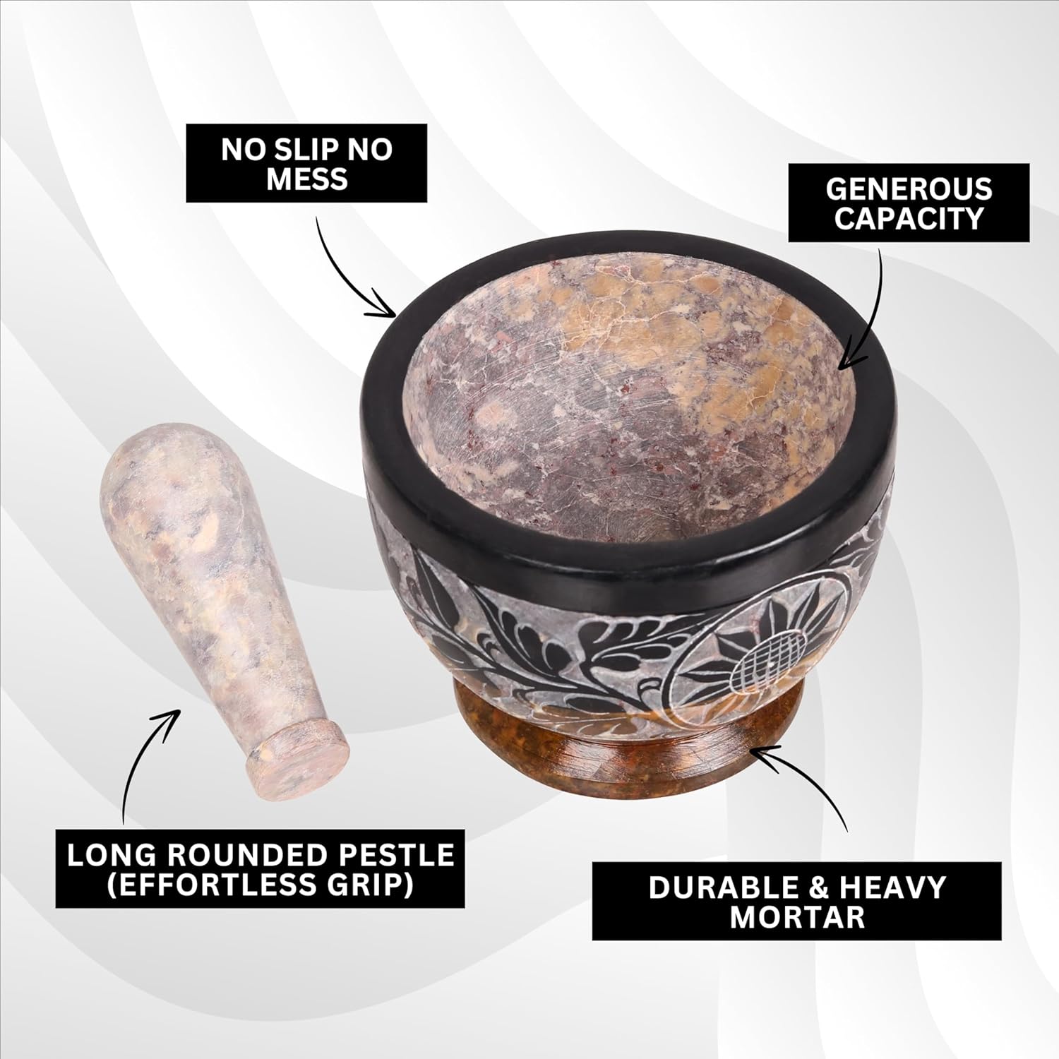- CLASSIC DESIGNING: The outer polished surface engraving makes it look trendy and exotic when placed on the shelf of your kitchen. The inner part of the mortar is rough that provides an excellent surface for dry and wet mixing. The pestle is made in such a manner that it makes full contact with all the ingredients and bring out the hidden flavors that are usually missed with machine- grinding. It comes with a broad and narrow end, both of which can be used depending on the purpose.