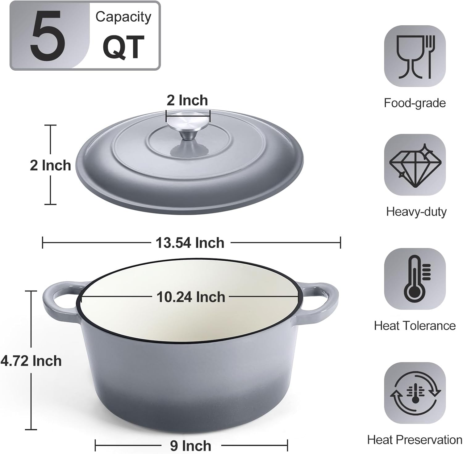 P&P CHEF 5QT Enameled Dutch Oven, Cast Iron Dutch Oven Pot with Lid for Bread Baking, Enameled Casserole Pot for Roasting Braising Stewing Frying Simmering, Various Stoves & Easy Clean, Grey