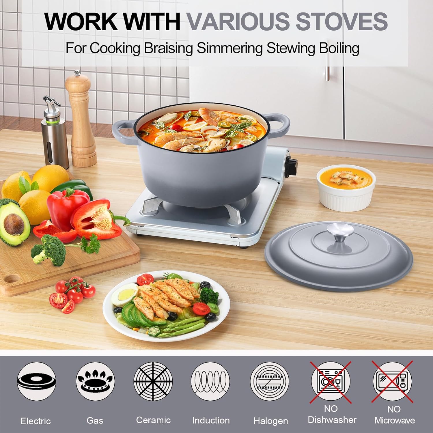 - 【Considerate Designs】Our cast Iron dutch oven comes with thickened EPE foam & carton double packing, Protect your dutch oven roundly in delivery, Ergonomic lid handle provides comfortable holding, Wide sturdy one-piece handles ensure a firm grasp, No worries about handles falling apart, Classic grey color will decor your kitchen