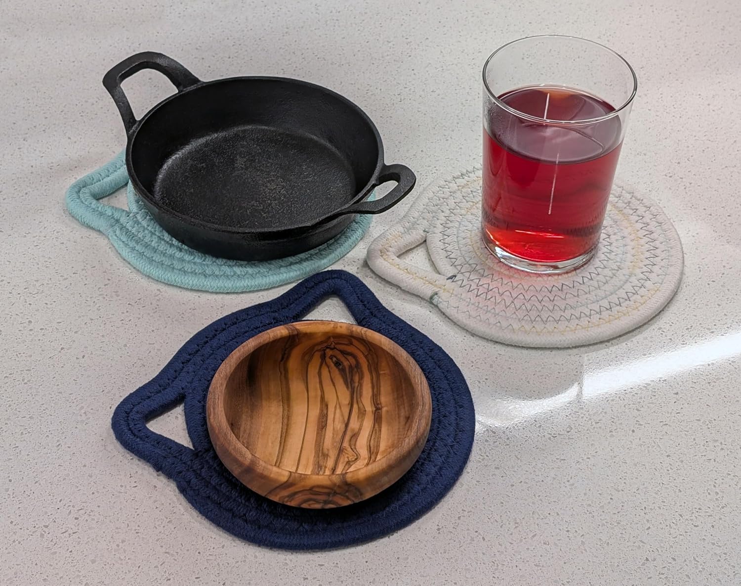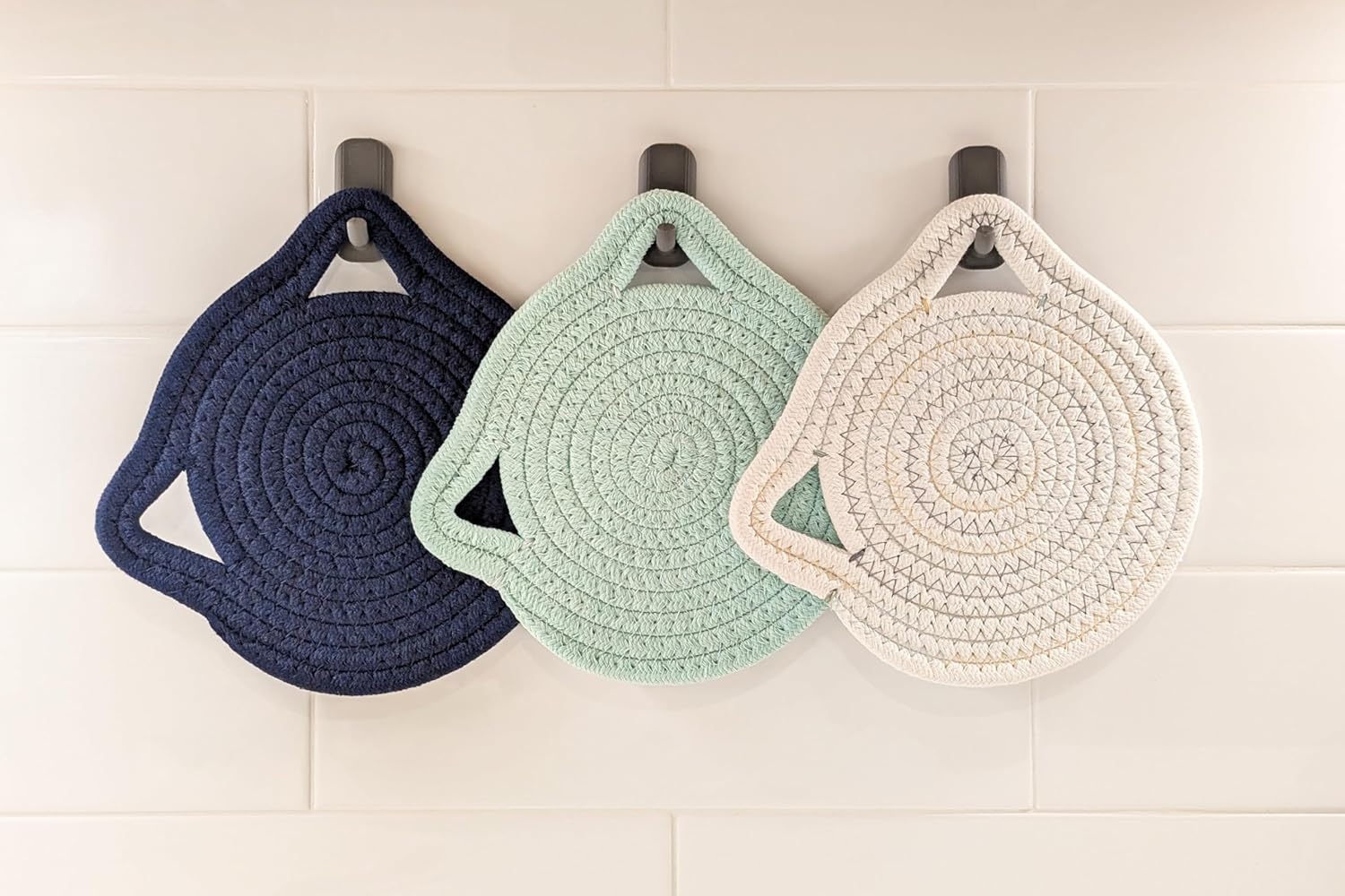 - Durable Materials: These trivets are made of woven cotton and are soft and flexible. Each trivet is about 7” in diameter and 0.3” thick.
