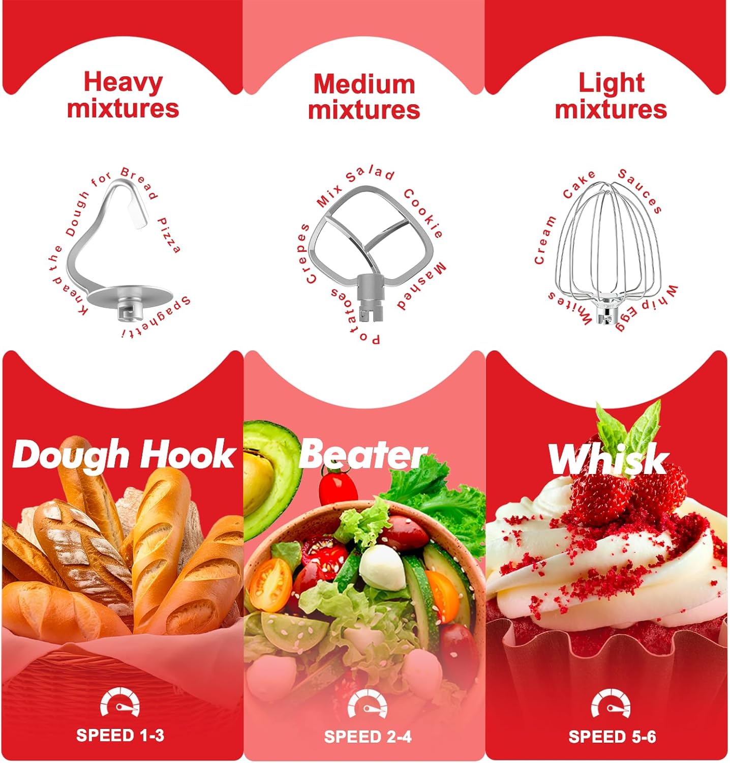 - Multiple Accessories: This electric mixer is fully equipped with accessories, including a dough hook; beater; wire whip,upgraded metal accessories can be directly loaded into the dishwasher,and has a splash-proof cover for the filling port to keep the kitchen clean