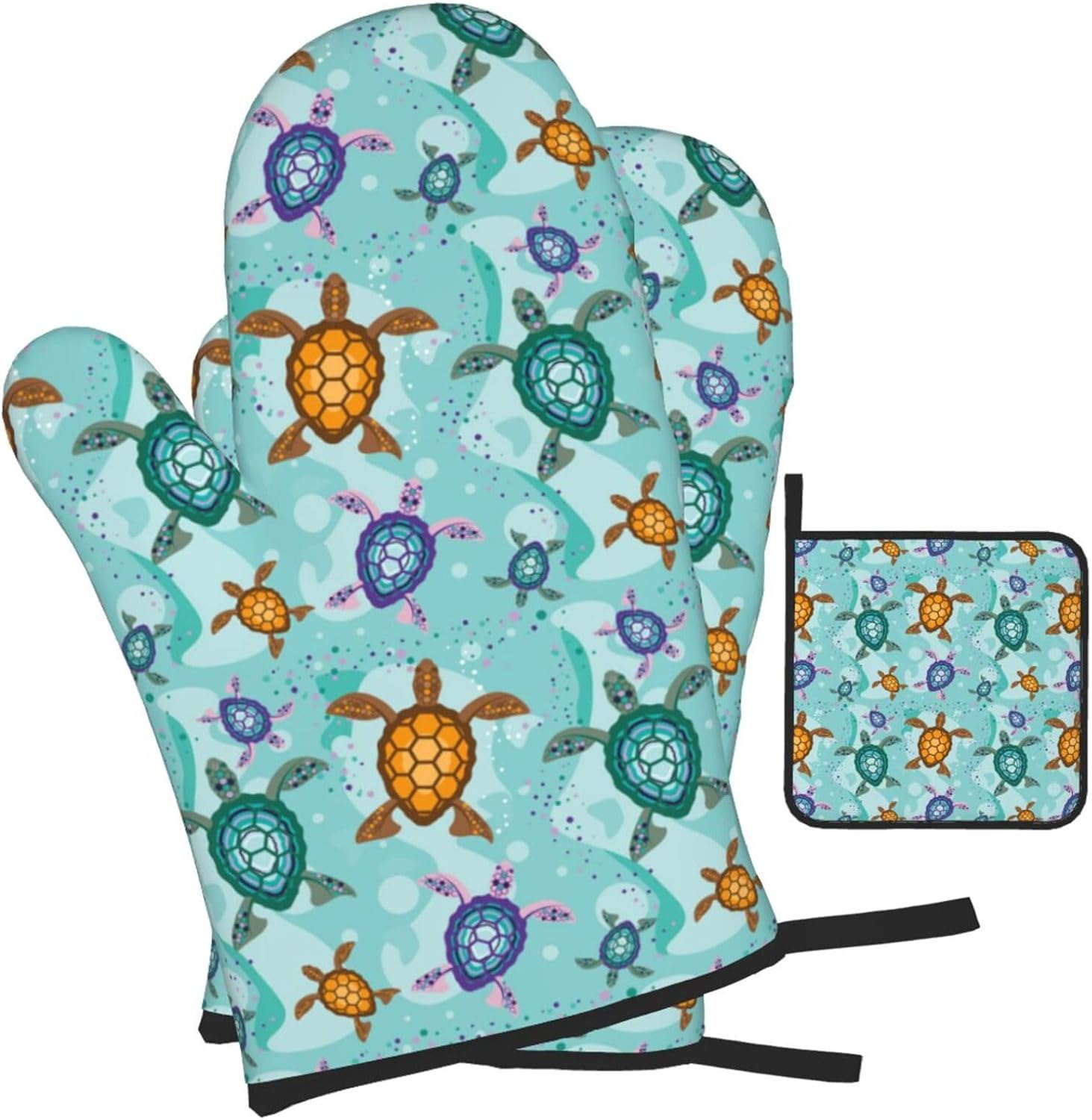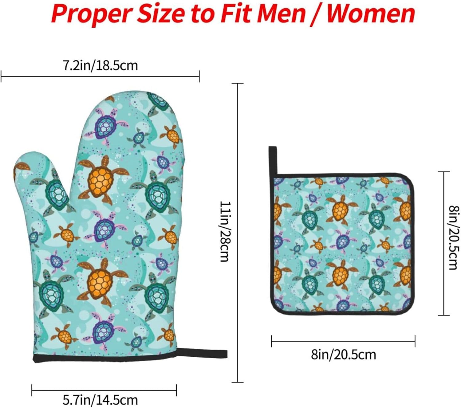 Cute Sea Turtle Beach Oven Mitts and Pot Holders Set Ocean Themed Decorative Heat Resistant Microwave Oven Gloves for BBQ Baking Grilling Cooks Kitchen Decor 3 Piece