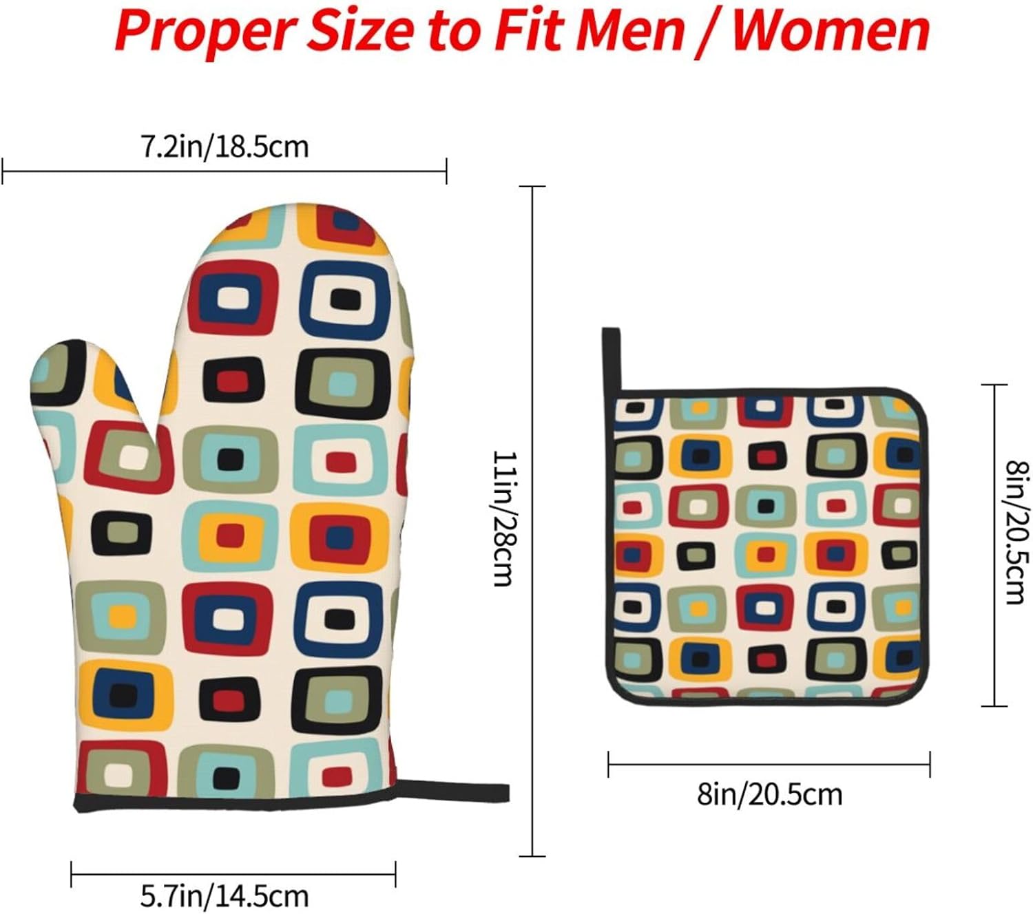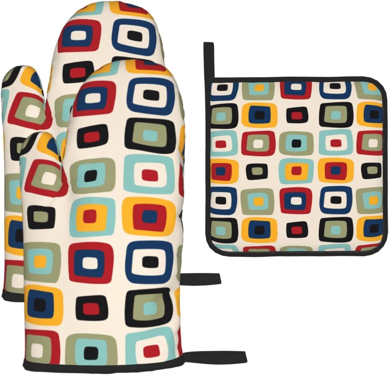 Mid Century Modern Retro Oven Mitts and Pot Holders Sets of 3 Heat Resistant Non Slip Vintage Decorative BBQ Gloves for Cooking Grilling Baking Kitchen Decor