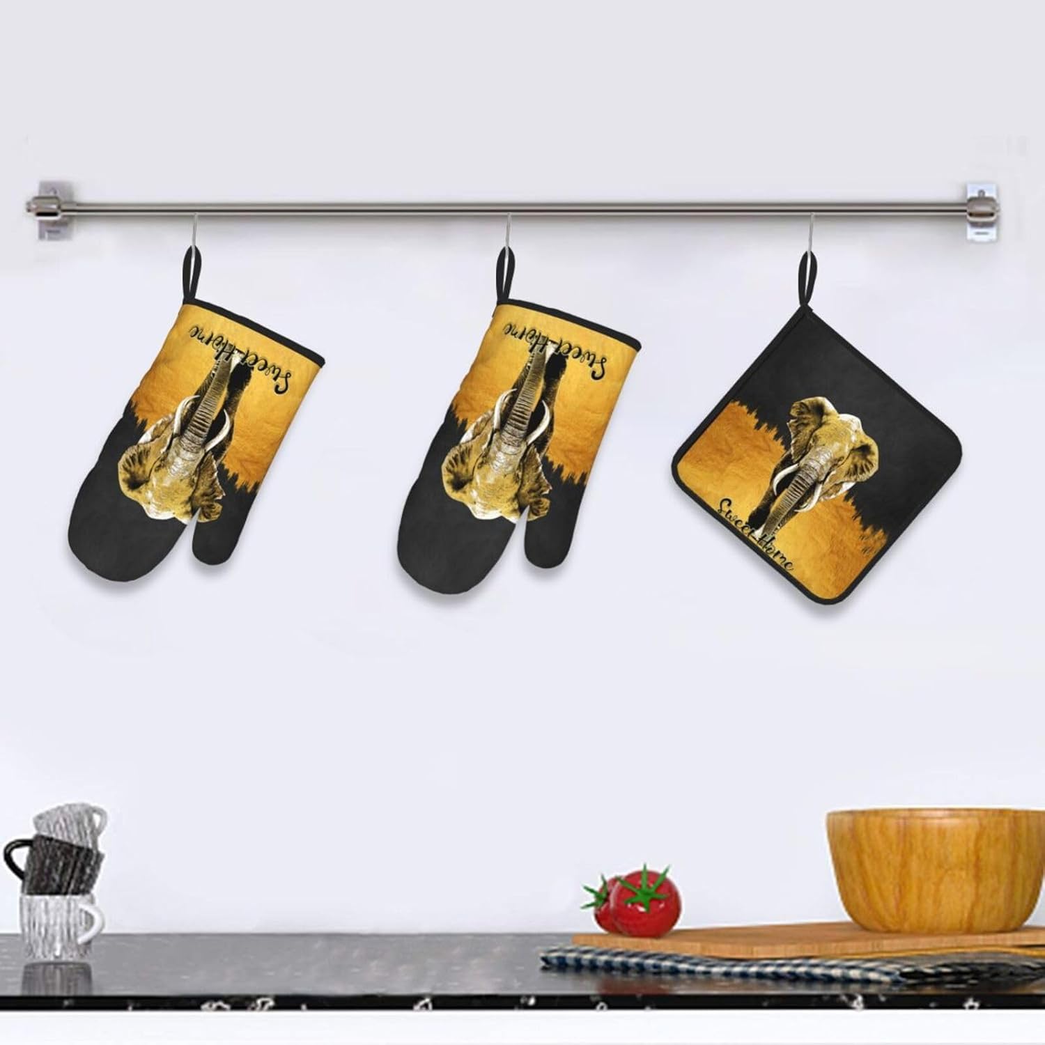 Elephant Oven Mitts and Pot Holders Sets of 3 Black Gold Hot Pads Oven Gloves Heat Resistant Non Slip Washable for Kitchen Cooking Grilling Baking