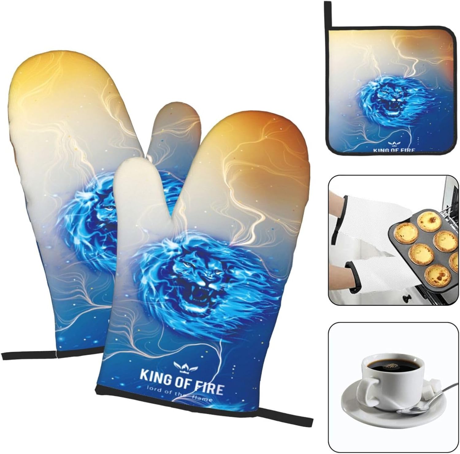 Orange Blue Oven Mitts and Pot Holders Sets of 3 Heat Resistant Funny Hot Pads Lion Oven Gloves for Kitchen Cooking BBQ Baking