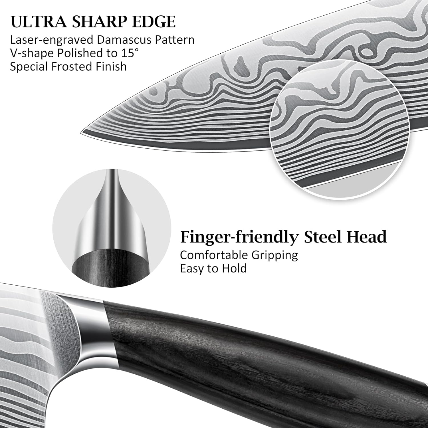 - 【Ergonomic Wood Handle】Blade is seamlessly riveted into the handle which makes it more strength; The pakkawood handle with streamlined ergonomical design is easy to grip, making long sessions of food prep virtually effortless and fatigue-free for fingers, wrists and forearms while adding aesthetic value to the knife set