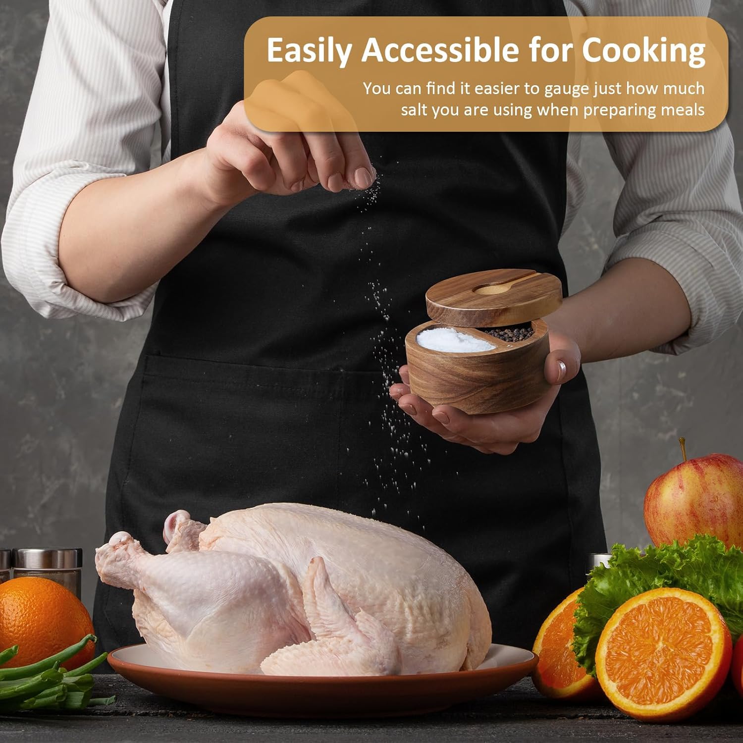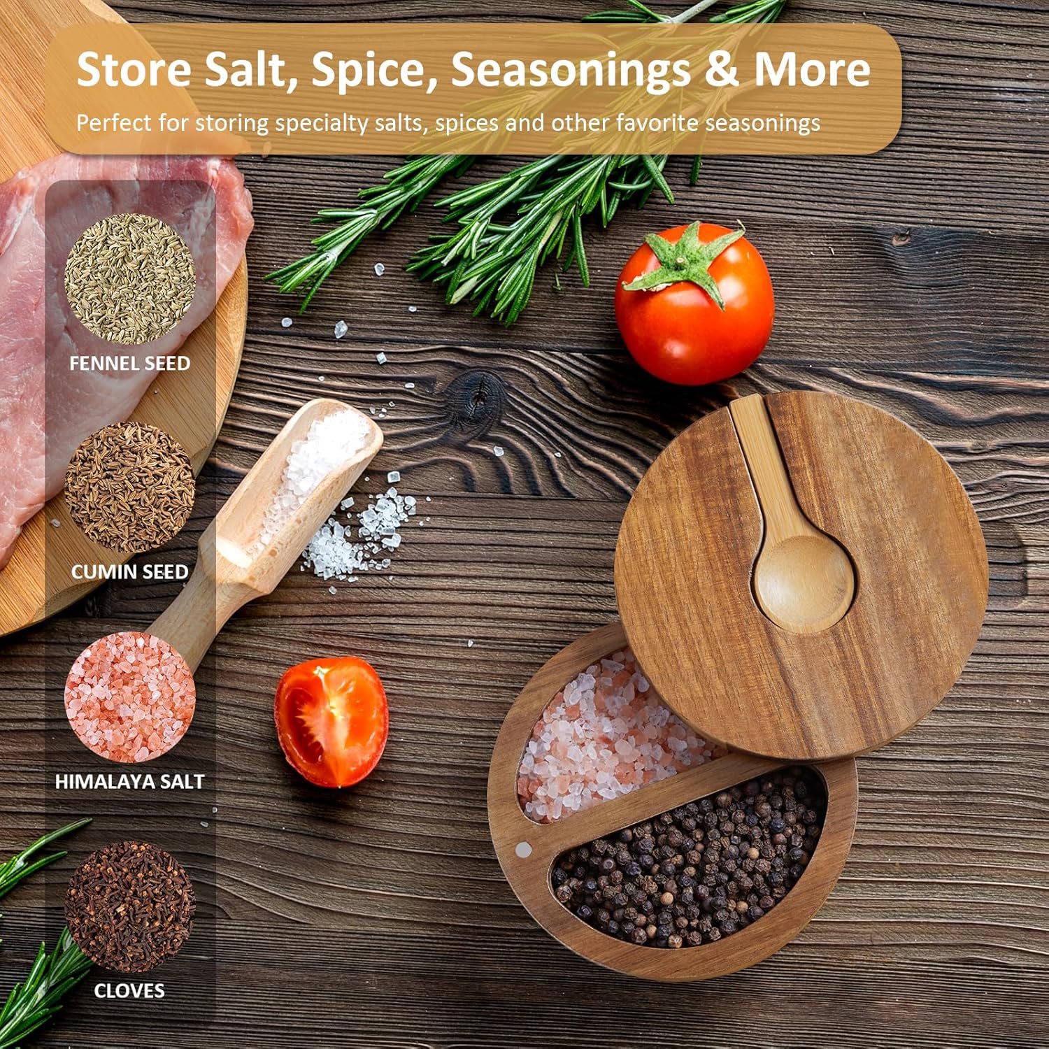 2-Compartment Acacia Salt Box with Lid and Spoon, Salt Cellar with Swivel Lid, Salt Container Holder for Sea Salt Herbs or Favorite Seasonings, Dual 6 oz Salt Bowl