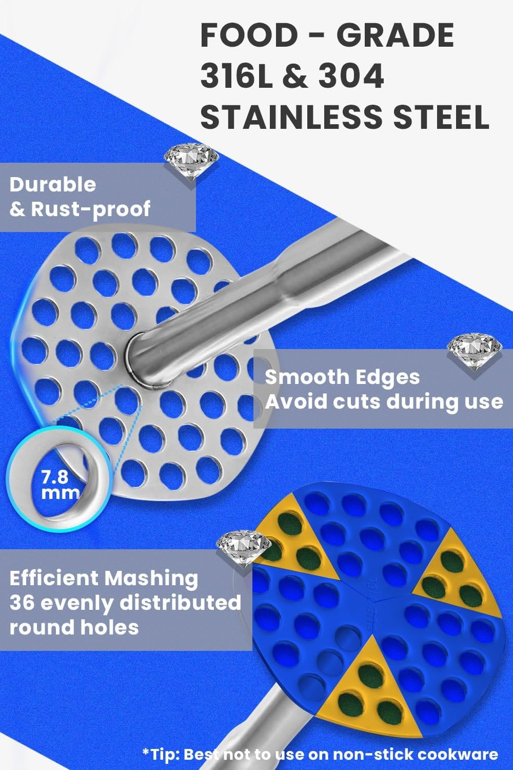 - 316L FOOD-GRADE - The potato masher's head is crafted from food-grade 316L stainless steel, paired with a food-grade 304 stainless steel handle. Solid and durable, it resists rust and cracking for long-lasting performance