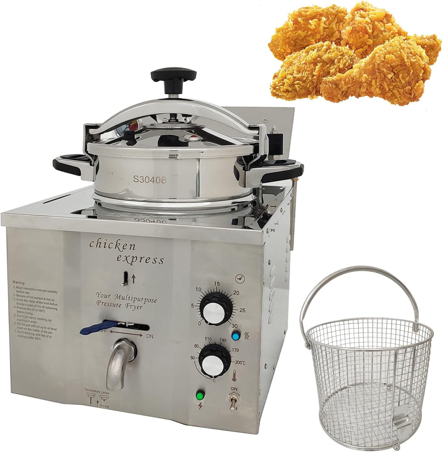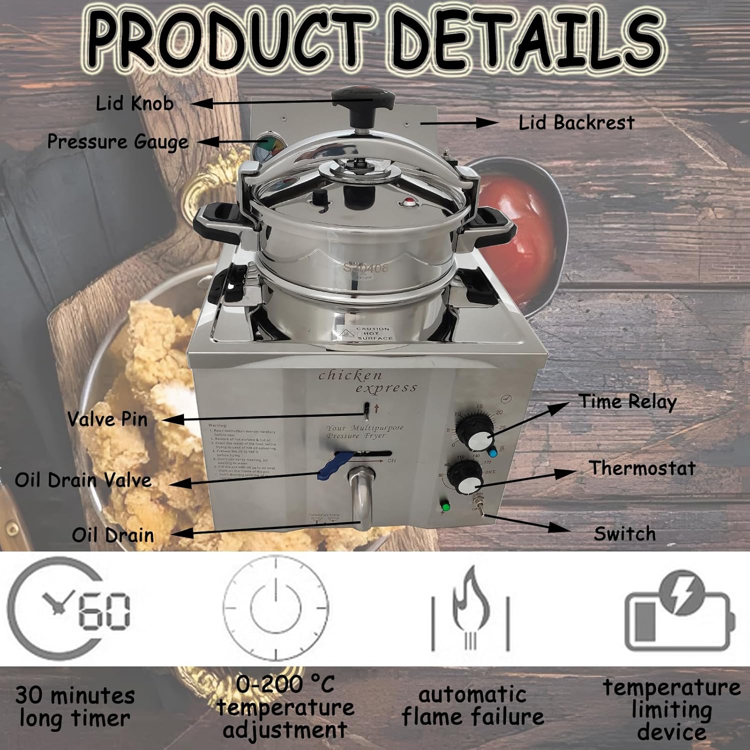 - Widely Application: Made from a high grade stainless steel,timer fitted,variable thermostat,drain tap,fryer basket,pressure valve,pressure gauge,rubber feet for stability, it is ideal for restaurants, supermarkets, fast food stands, snack bars, parties