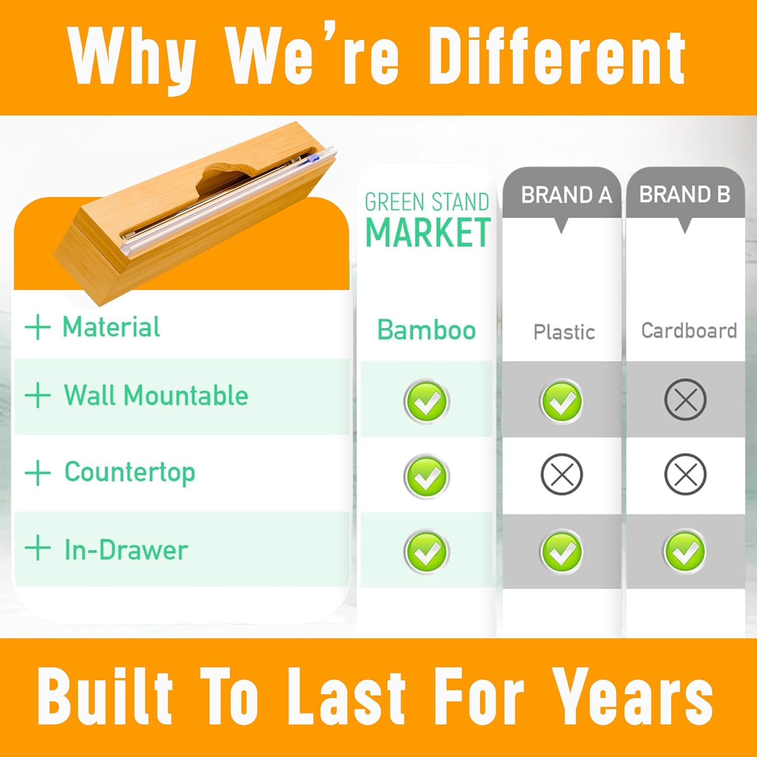 - ECO-FRIENDLY: Constructed from high-quality bamboo, this foil dispenser offers an eco-conscious alternative to plastic. The bamboo wrap organizer is versatile—depending on your space requirements, you can mount it on the wall or use it in a drawer or countertop