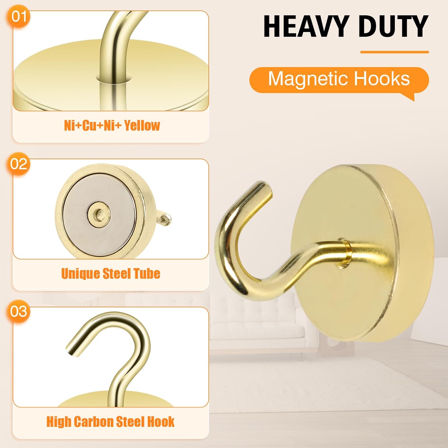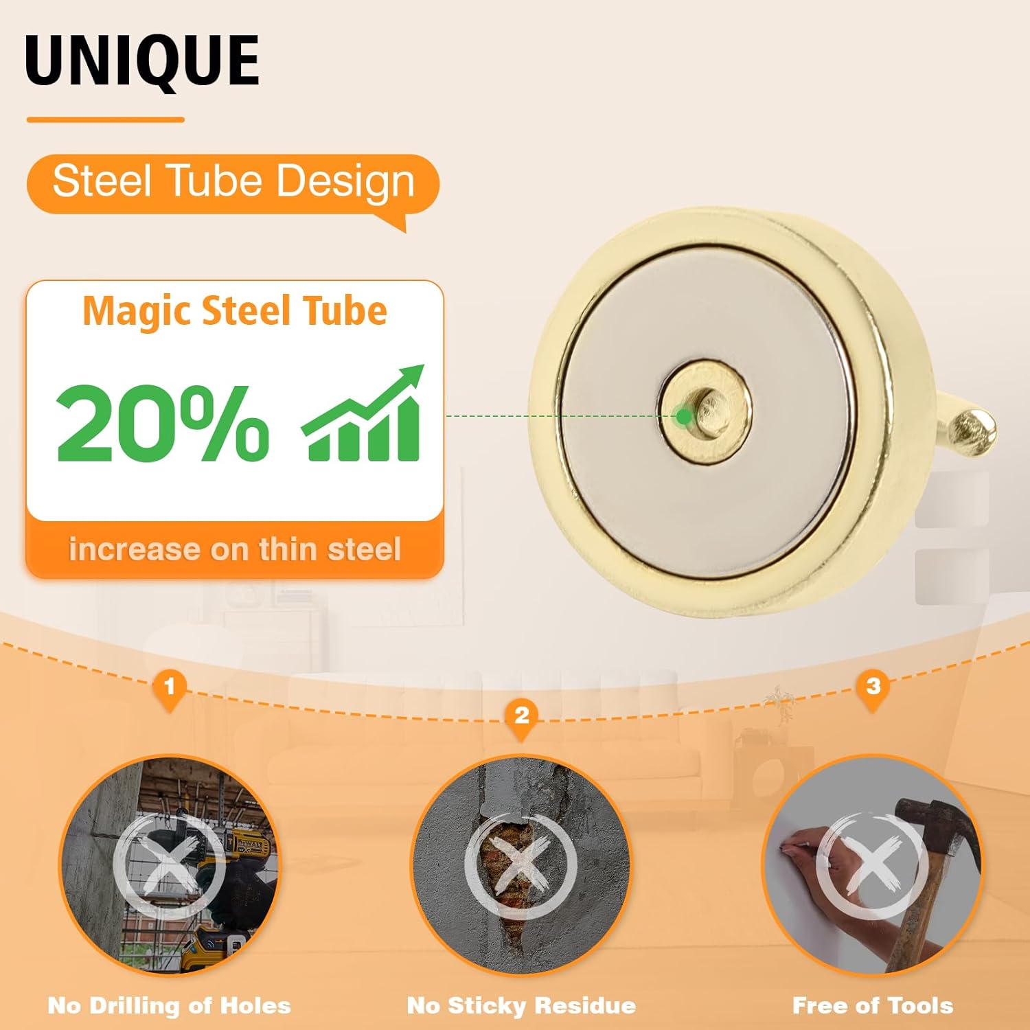 - ✔MAGIC STEEL TUBE DESIGN - Unique design of steel tube inside the base of magnetic hooks greatly increases the attractive force , especially on thin steel! It increase approximately 20% force comparing those none-tube magnets. it solves the problem of weak force on thin steel. Permanent magnetic hook with magic steel tube, strong magnetism lasts forever!