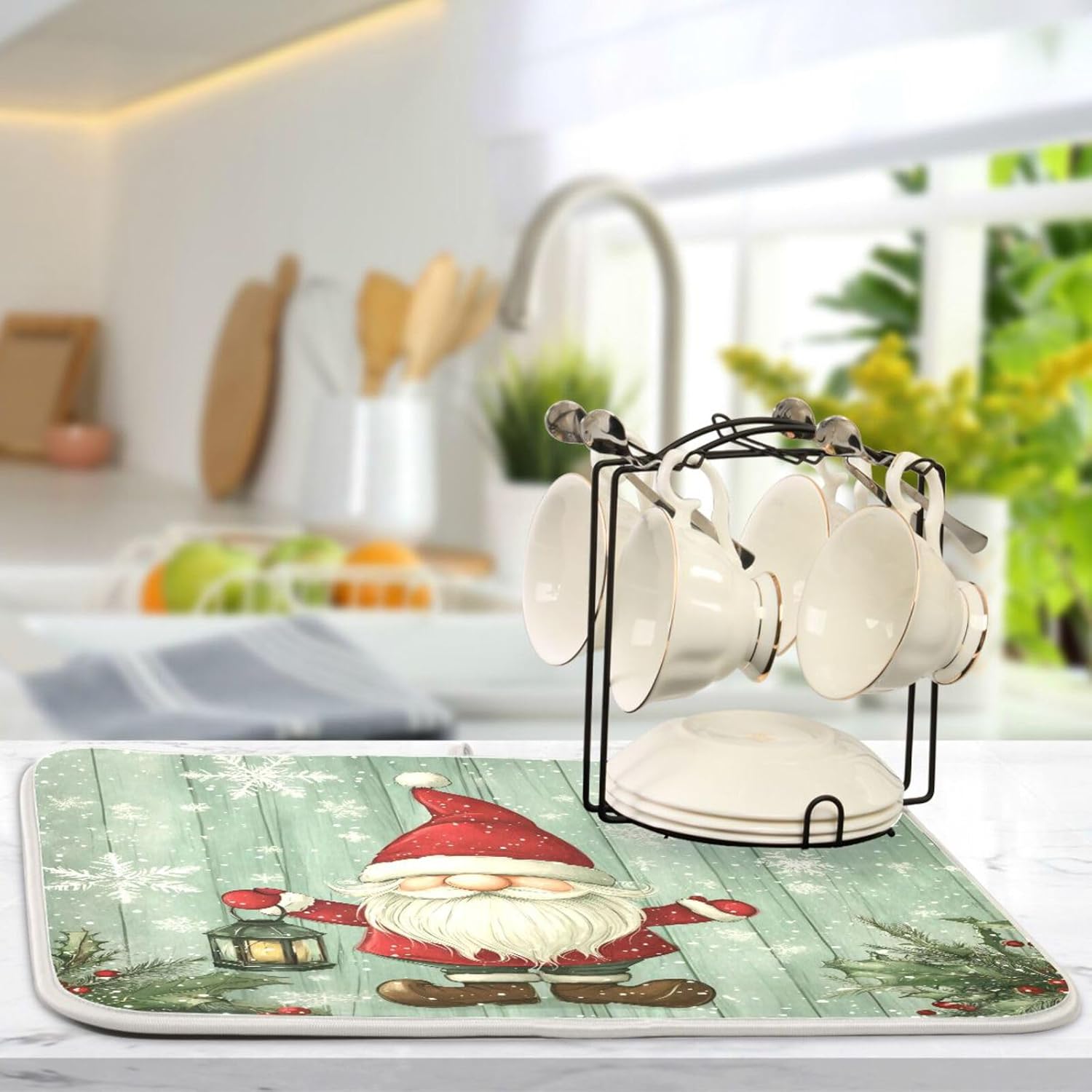 Christmas Gnome with Lantern Dish Drying Mat for Kitchen Counter Absorbent Microfiber Drying Pad, Large 18x24 in, Reversible Drainer Mats