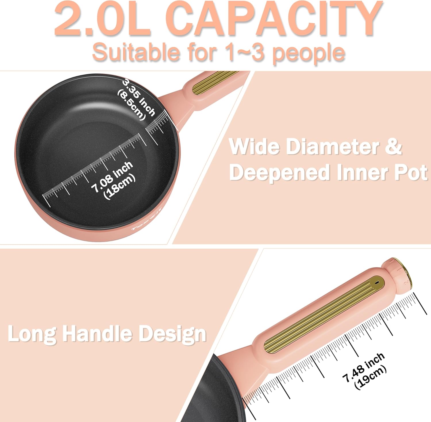 - 【2L Capacity Electric Pot】 This electric pot has a 2-liter capacity, with an inner diameter of 7.08 inches and a depth of 3.35 inches, making it ideal for frying, sautéing, braising, stir-frying, and cooking. With the extended handle design measuring 7.48 inches long, it ensures a more comfortable grip and easy use, also reducing the effort required for handling and making it more labor-saving.