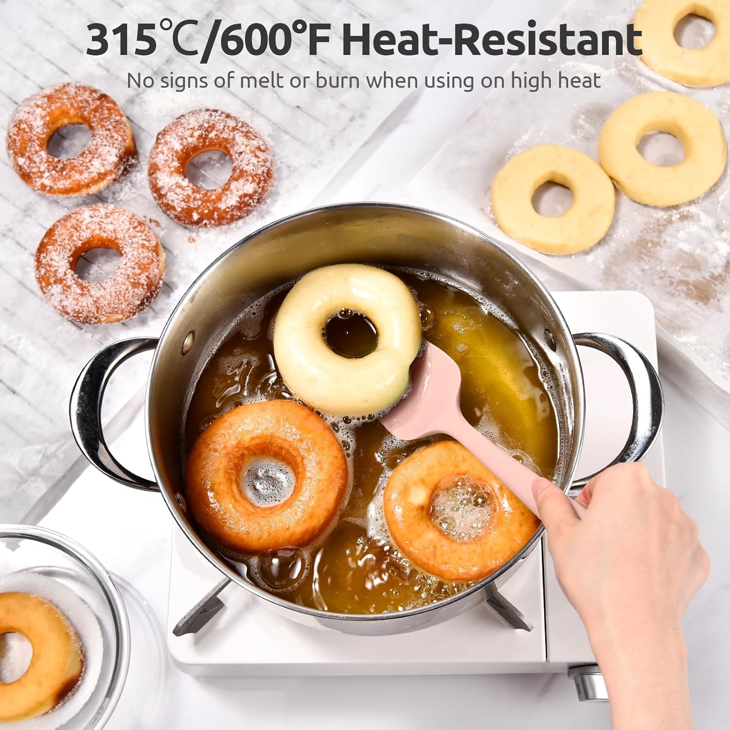 - [600ºF Heat-Resistant for High Heat Cooking] With up to 600 degrees heat resistance, you can use this nonstick silicone spatula in a hot pan without worrying about melted plastic in your dinner. It also works well with high temp sugars, chocolates or sauces. A must for newer cooks who might tend to leave utensils in a nonstick pot while cooking. You can use this heat safe silicone scraper daily for everything from stirring to frying to smoothing.