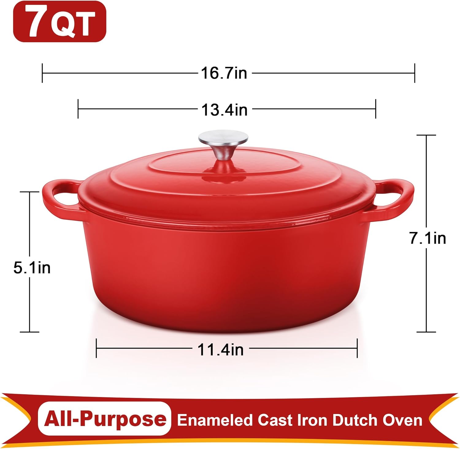 E-far 7QT Oval Dutch Oven Pot with Lid, Enameled Cast Iron Dutch Oven with Dual Handles for Sourdough Bread Baking Cooking, Nonstick Enamel Coated Cookware(Red), Non-Toxic & Easy Clean