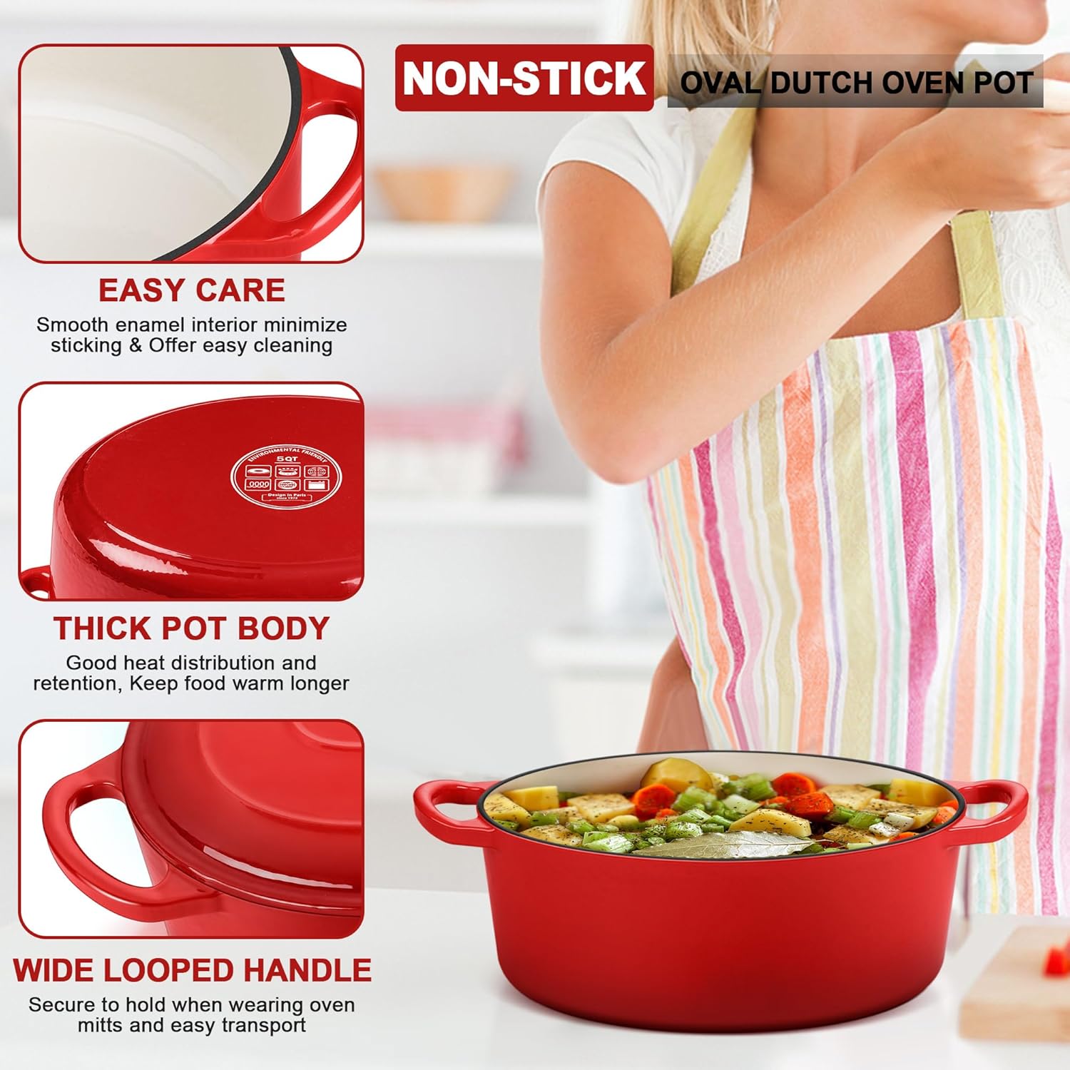 E-far 5QT Oval Dutch Oven Pot with Lid, Enameled Cast Iron Dutch Oven with Dual Handles for Sourdough Bread Baking Cooking, Nonstick Enamel Coated Cookware(Red), Non-Toxic & Easy Clean