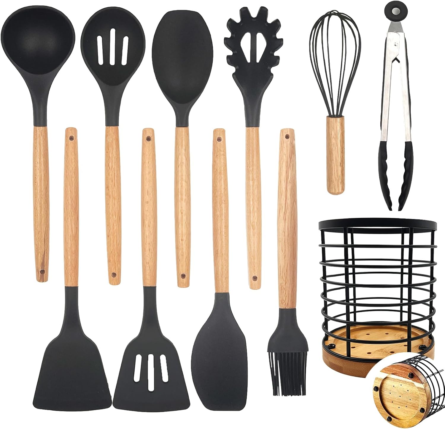 - 【Wooden Base and Premium Materials Storage Holder】The storage bucket is designed with a farmhouse style wooden base, which not only creates a cozy kitchen atmosphere, but also the material of the storage bucket is sturdy and durable with a large capacity, which is not easy to rust and break, ensuring the long-term use of the product.The storage bucket in the silicone cooking utensils set set facilitates the organization and storage of kitchenware, making the kitchen space more neat and orderly