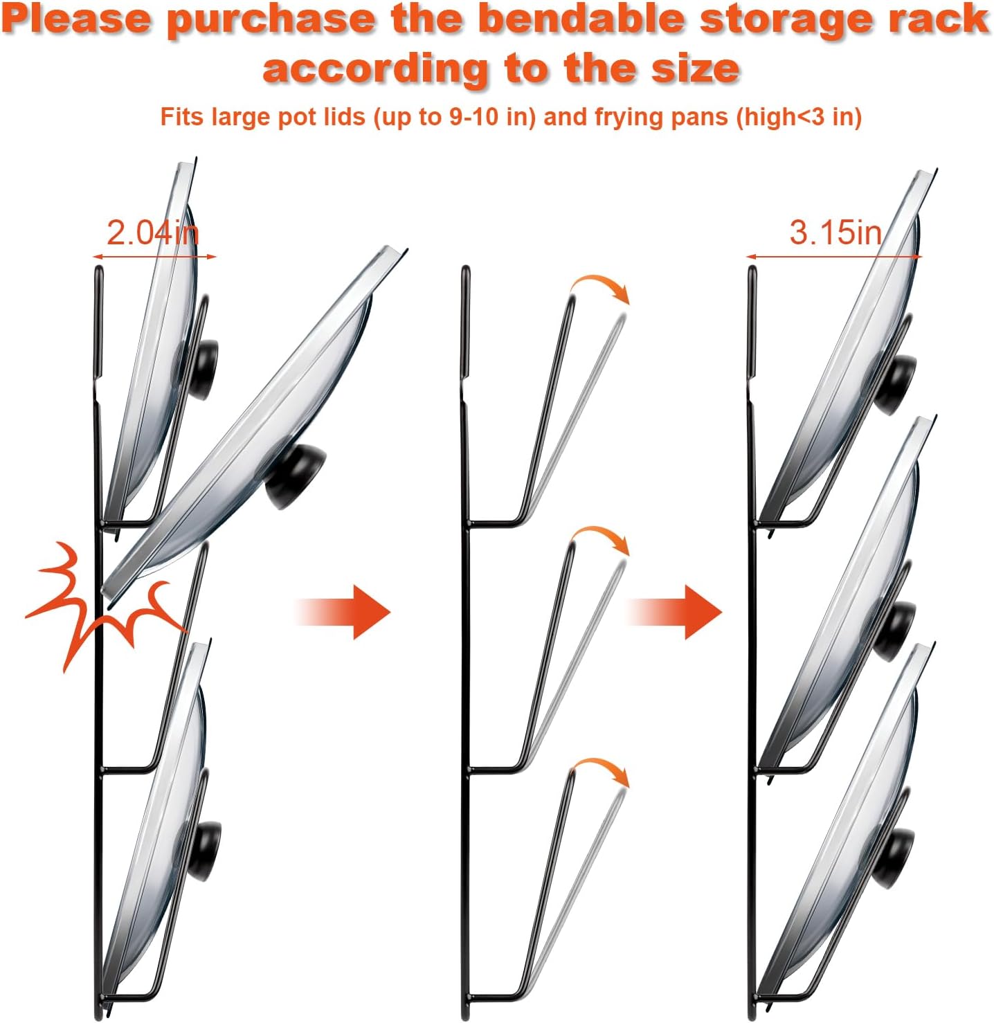 - SPACE-SAVING POT LID ORGANIZER: This pots and pans organizer under cabinet with 6 adjustable slots (4" - 13") & can be used as a wall mounted pot lid rack to store 6 pot lids while keeping the 2" slots curved to accommodate different pot lids