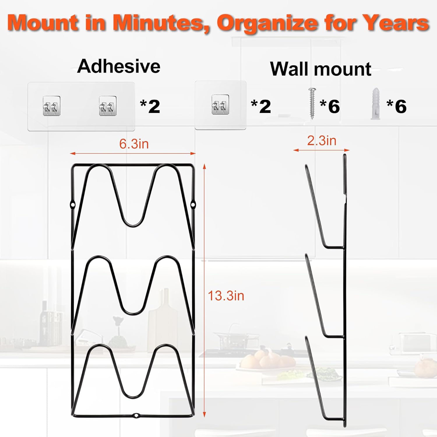 - COMPLETE LID STORAGE SOLUTION: Includes 2 pot lid organizers for cabinet doors (6.3 x 2.4 x 13.6 inches) + 4 self-adhesive stickers, 6 nails and 6 plastic anchor. Can be used vertically as a pot lid support in a cupboard. (24/7 technical support)