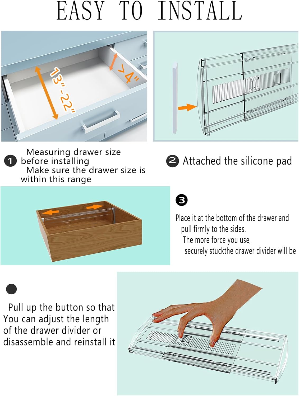 - 2:Easy to Use--1: Attach our matching EVA(Protect drawers from damage) 2:Place it at the bottom of the drawer and pull it forcefully on both sides. The harder you apply, Drawer Dividers Organizer the more firmly stand