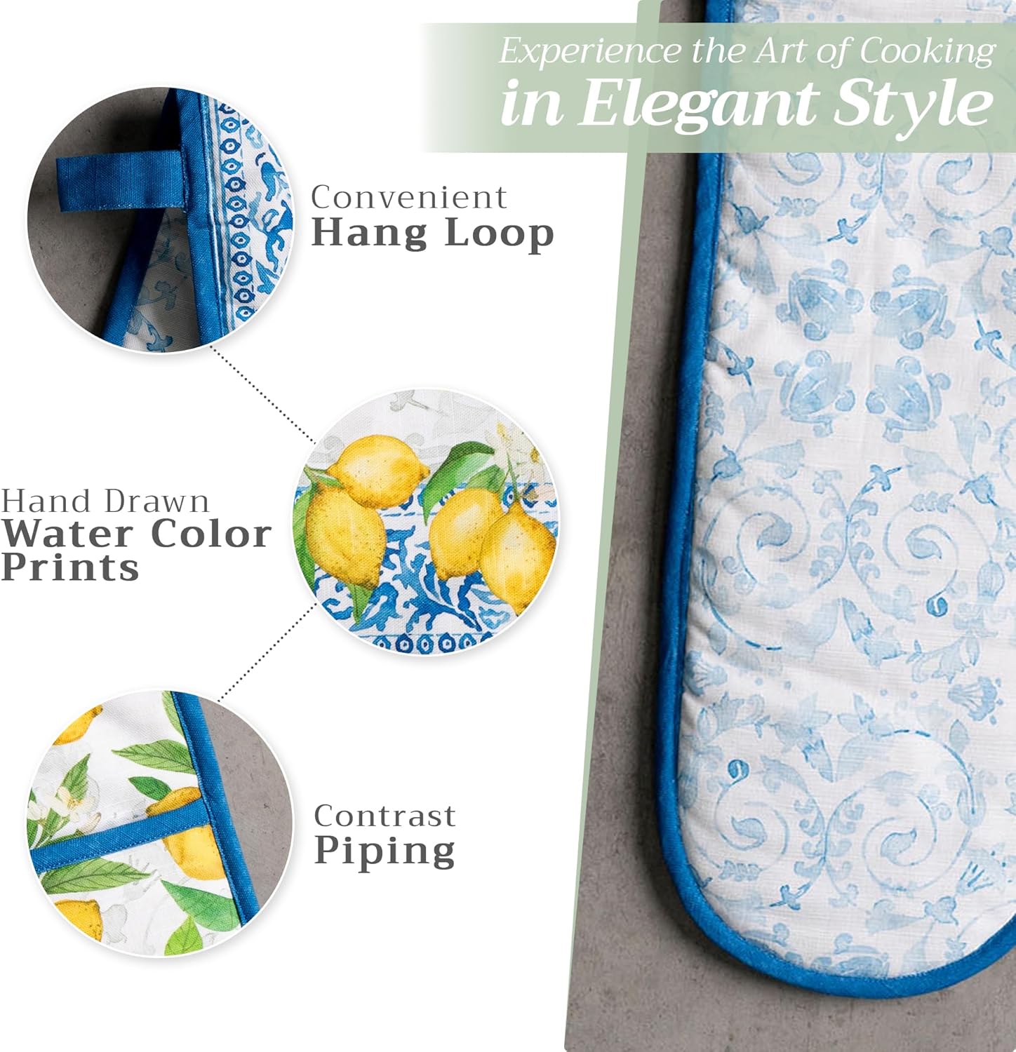 - Package includes: Includes 1 double oven mitt sized 7"x35". Perfect for handling hot cookware safely while adding a touch of European elegance to your kitchen. Designed in Europe and made in India with care