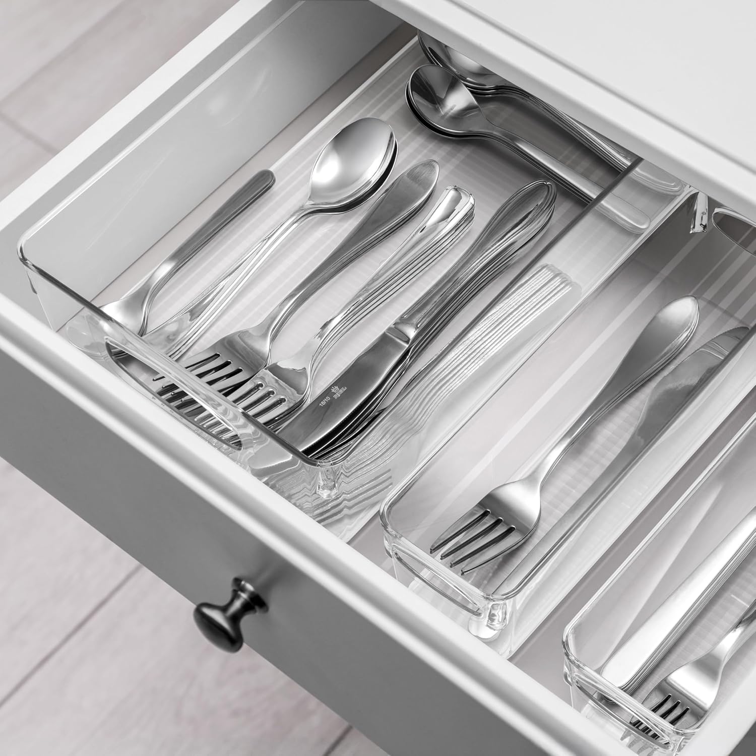 - Set Includes and Dimensions: This set includes 20 clear plastic storage bins in a variety of sizes: 8 Small (9.5 x 3 x 3 inches) for compact storage, 4 Medium (10.25 x 6.25 x 3.15 inches) for mid-sized items, 4 Large (11 x 7 x 3.25 inches) for larger essentials, and 4 X-Large (11.75 x 7.5 x 3.25 inches) for maximum storage needs