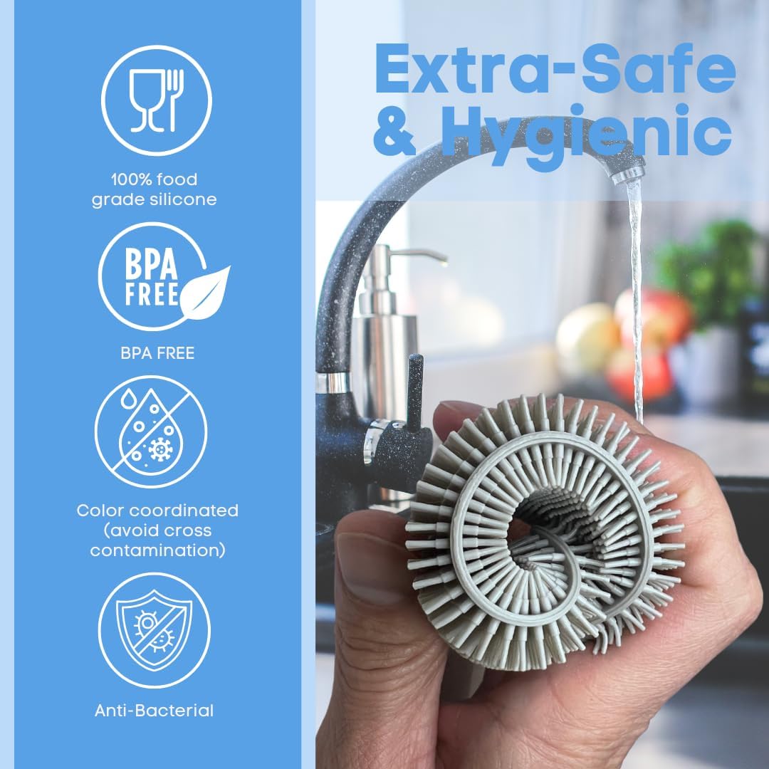 - Unlike other silicone dish scrubber designs that don't hold on to soap - so you have to keep adding more - our silicone sponges for dishes works efficiently with your favorite soaps and degreasers, so you can use less cleaning fluids. In fact, this kitchen scrubber is designed to make cleaning more efficient all around