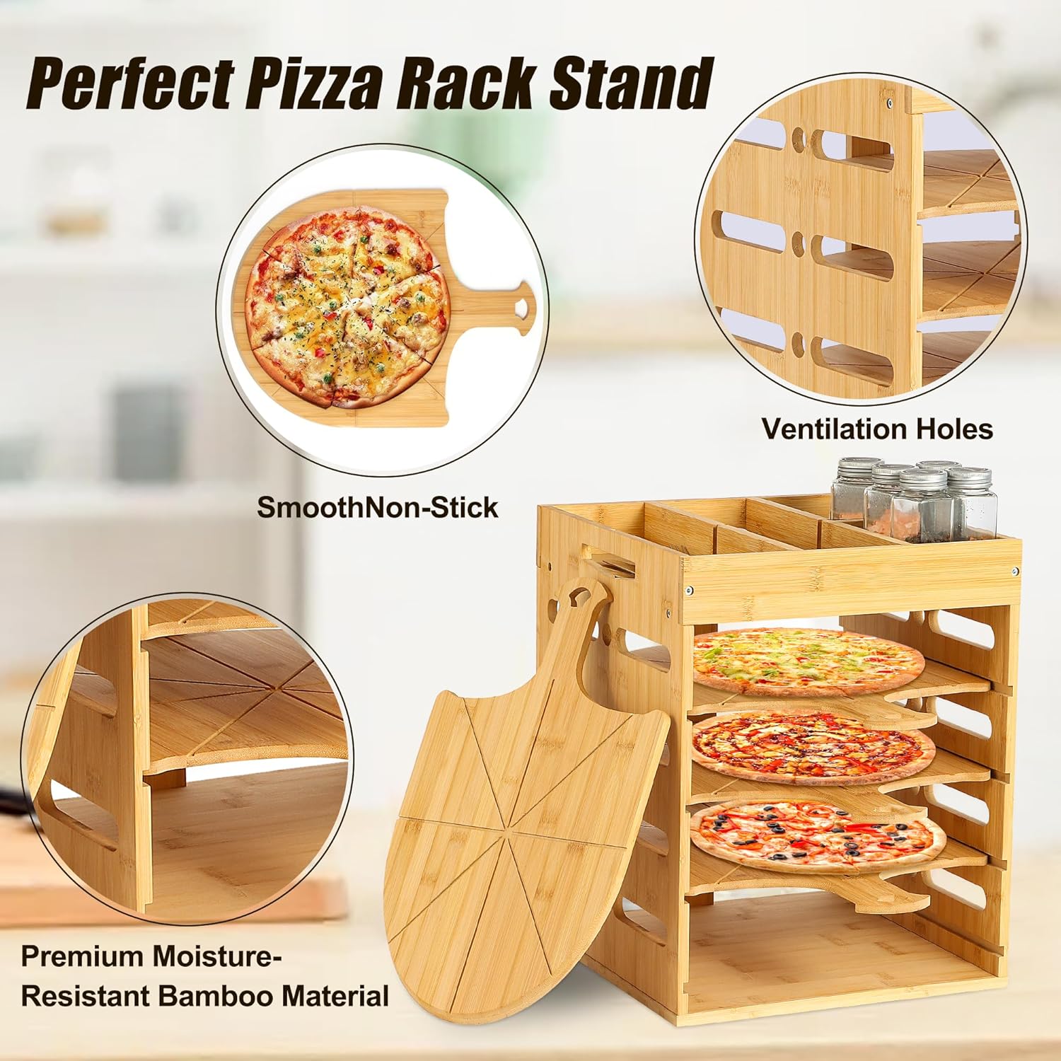 - Versatile Top Storage Divider Pizza Rack Stand: The top of the pizza rack features a convenient storage divider for organizing condiments, utensils, napkins, or extra toppings. Customize layout to accommodate items for a tidy, functional space