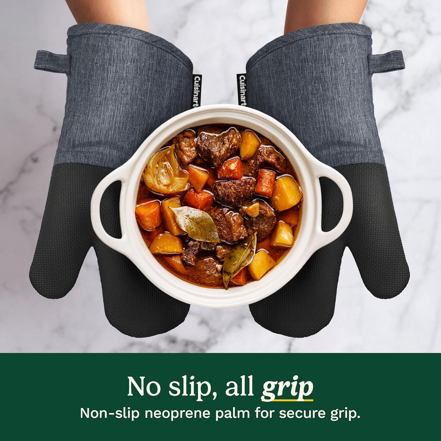 - COOK WITH CONFIDENCE: The Cuisinart Chambray Oven Mitt Set, measuring 7 x 13 inches, features a heat-resistant neoprene palm for superior protection (up to 350 degrees); handle hot cookware with ease and enjoy a secure grip with these oven mits, making cooking, baking, and grilling safer.