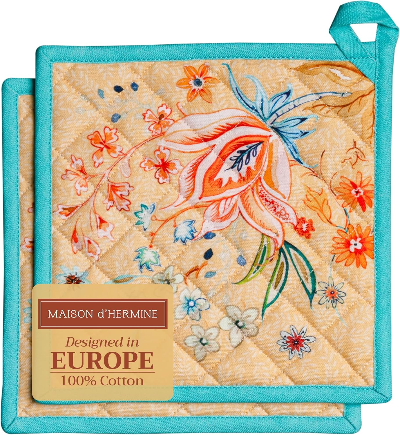 - Package includes: 2 pot holders measures 8"x8". Ideal as a hot pad for dishes, coffee pots, cast iron pans, or cookware. Designed in Europe and Made in India, it blends style, function, and comfort into a daily kitchen essential