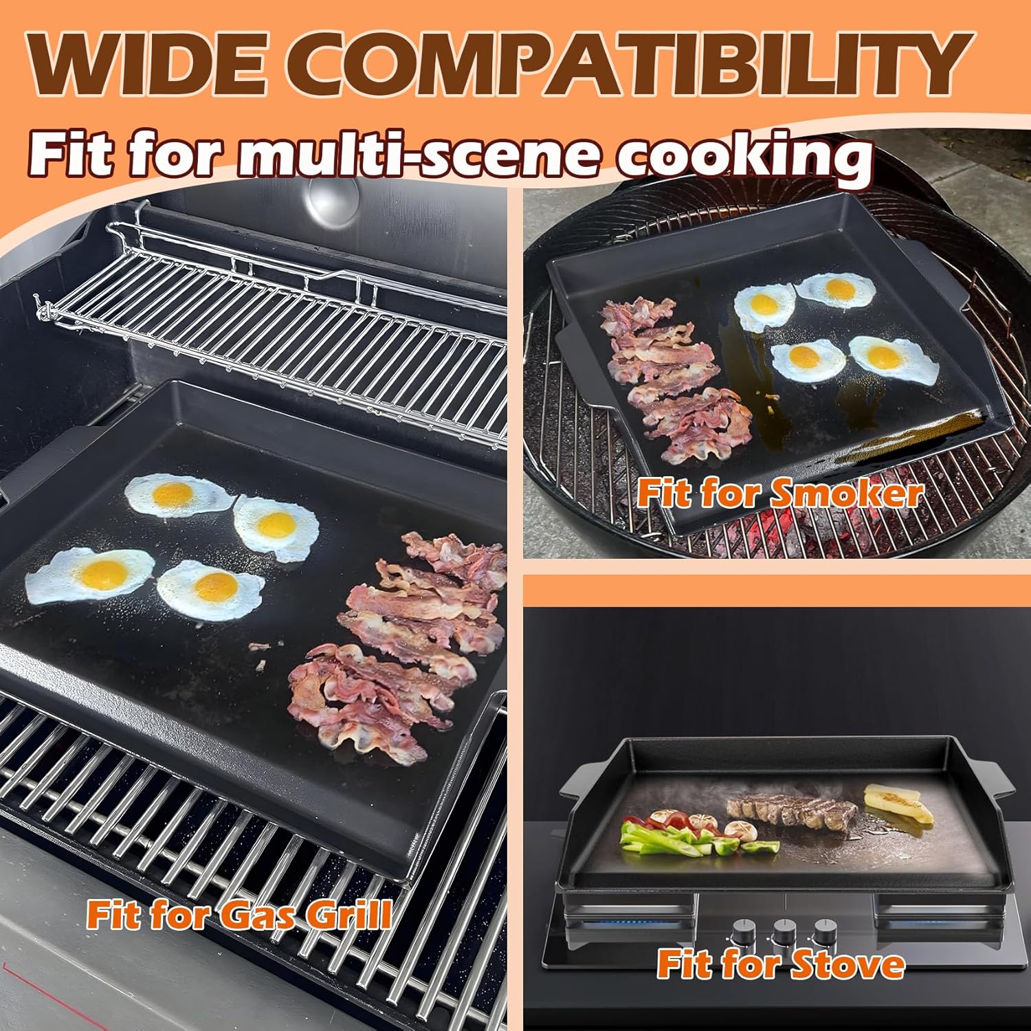 - UNIVERSAL COMPATIBILITY: This 18.6" L x 14" W Pre-Seasoned Nonstick Cast Iron Griddle with strong compatibility, it designed to fit most gas/charcoal/electric grills, gas stoves and outdoor burner stove top. Our flat top griddle for gas outdoor grill compatible with Weber Charbroil Nexgrill Camp Chef and more, cast iron griddle for stove top is perfect for daily cooking, camping, tailgating and gatherings