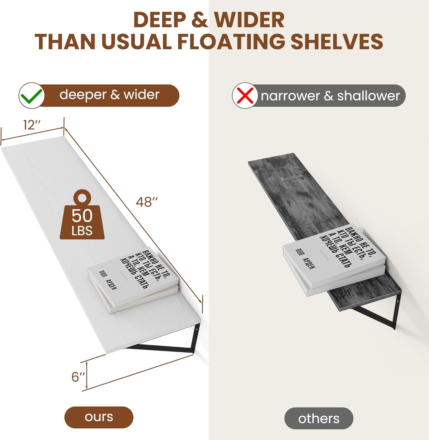 - [Size Does Matter] - These wall shelves are wider and longer than regular shelves on the market, providing more room and worry-free storage! Measures: 48Wx12Dx5.8H Easy to install within a few minutes with all necessary hardware included.