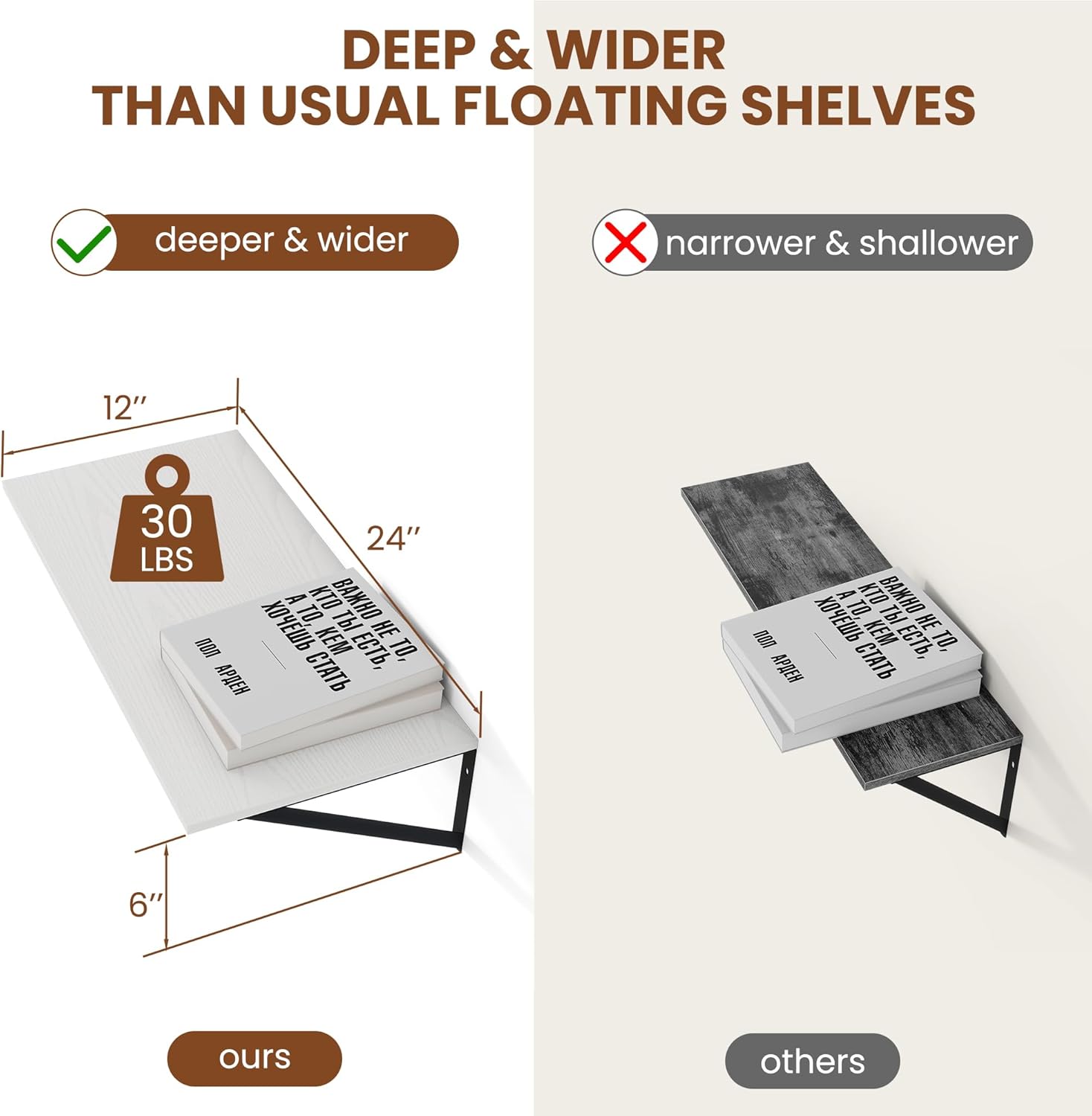 Heimlove White Deep Floating Shelves for Wall, 24W x 12D Wood Wall Shelves Set of 2, Wide Floating Bookshelf for Living Room, Kitchen, Office, Bedroom and Decor Storage, with Black Bracket - White