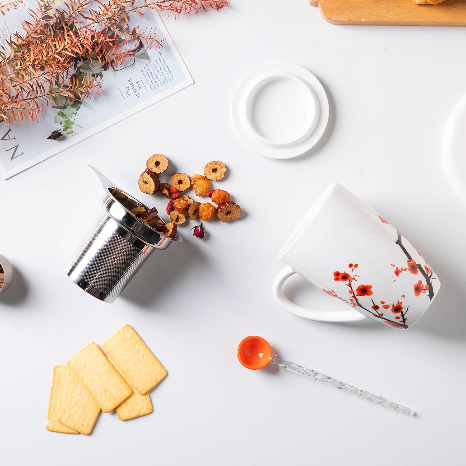 Sweejar Porcelain Tea Mug with Infuser and Lid,Teaware with Filter, Loose Leaf Tea Cup Steeper Maker, 16 Fl Oz for Tea/Coffee/Milk/Women/Office/Home/Gift (Plum Blossom)