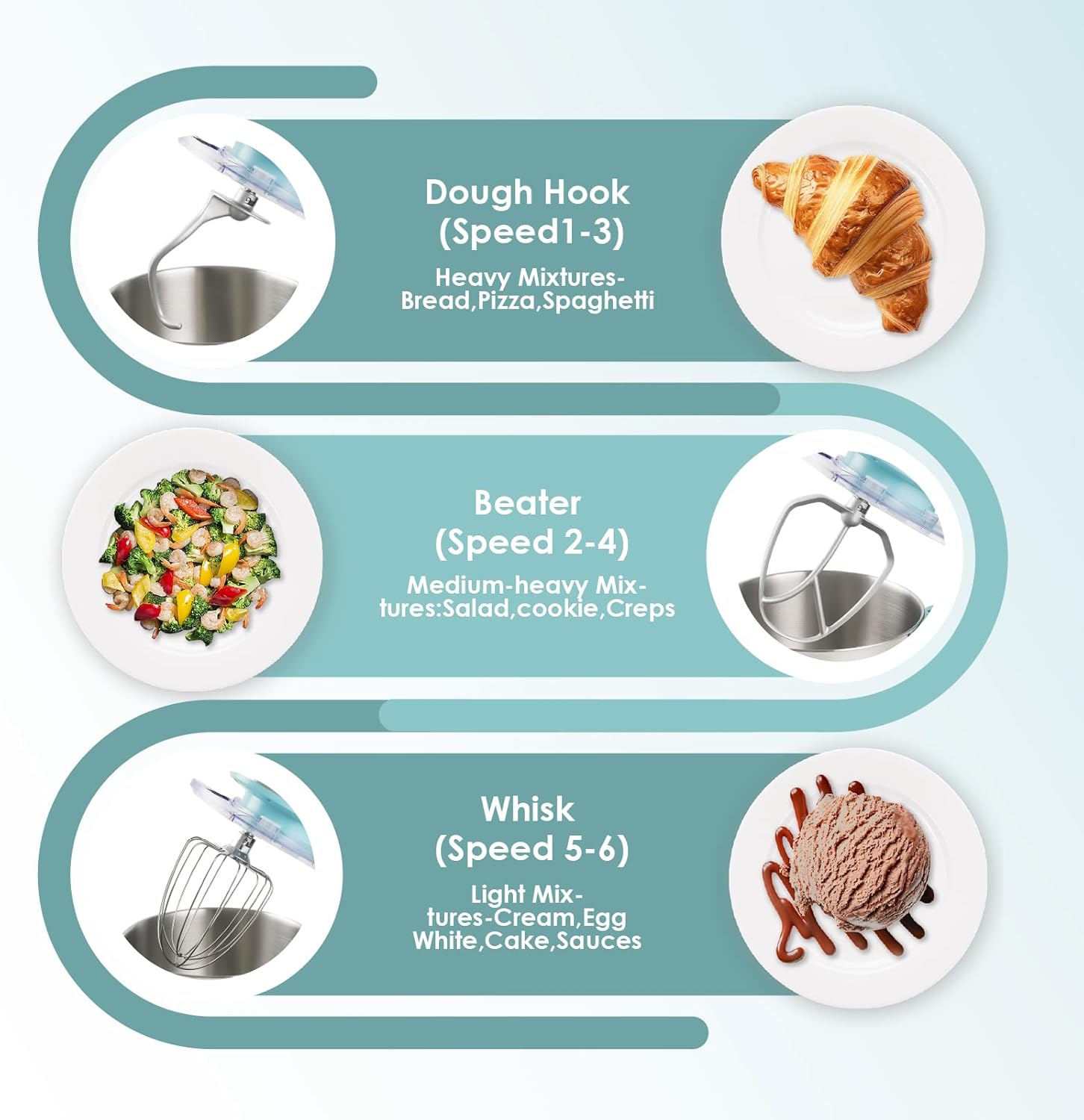 - 3 in 1 Electric Stand Mixer - Multi-functional solution for all mixing needs like cakes, bread, biscuits, pastries, muffins, waffles and etc. Dough hook for bread/pizza dough, whisk for fluffy egg whites/cream, beater for mixing cookie dough or salad evenly in minutes.