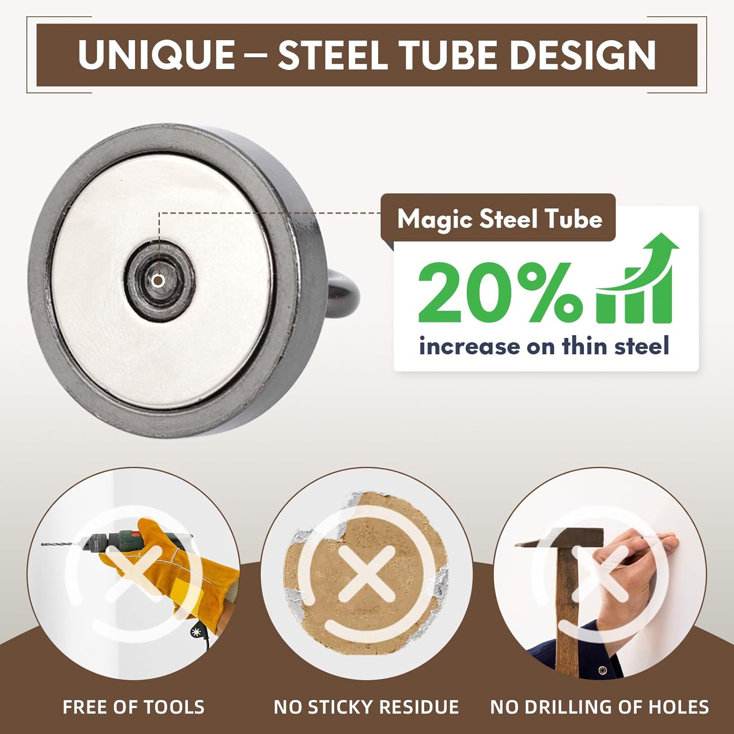- ✔MAGIC STEEL TUBE DESIGN - Unique design of steel tube inside the base of magnetic hooks greatly increases the attractive force , especially on thin steel! It increase approximately 20% force comparing those none-tube magnets. it solves the problem of weak force on thin steel. Permanent magnetic hook with magic steel tube, strong magnetism lasts forever!