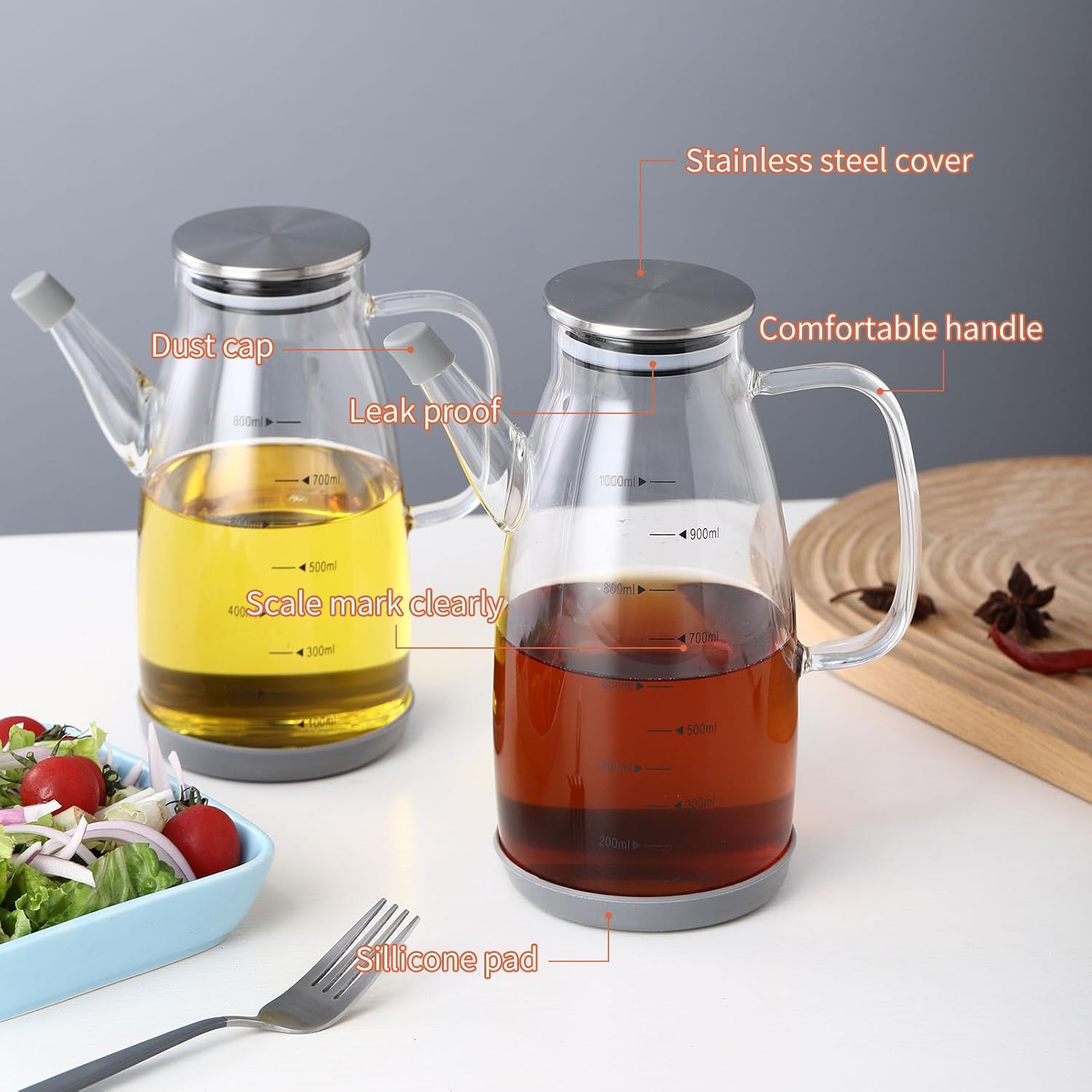 - 【Perfect design】Our olive oil dispenser, with a stainless steel lid. The oil jug has a milliliter scale that allows you to control the amount of olive oil or vinegar you use while cooking. We also have a silica cap that keeps out the dust, and a silica base that prevents collisions. let you use it in the kitchen, safe rest assured.
