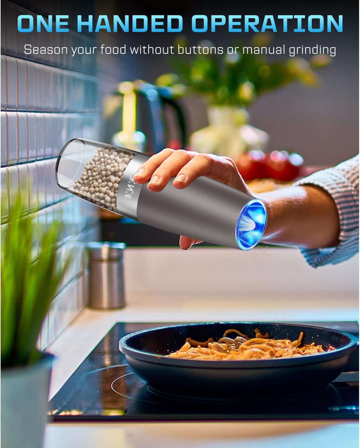 - 【Unique Design】Transparent acrylic material at the bottom allows you to see the remaining spices and convenient to distinguish the spices in the grinder. Turn the bottom container clockwise to open it. Turn the bottom container counterclockwise to close it. When closing, do not over-tighten it, otherwise it will require a lot of force to open it again. With the blue LED light, blue light is not only bright but also gentle, you can easily to see amount of pepper, salt and other grain you put in your food.