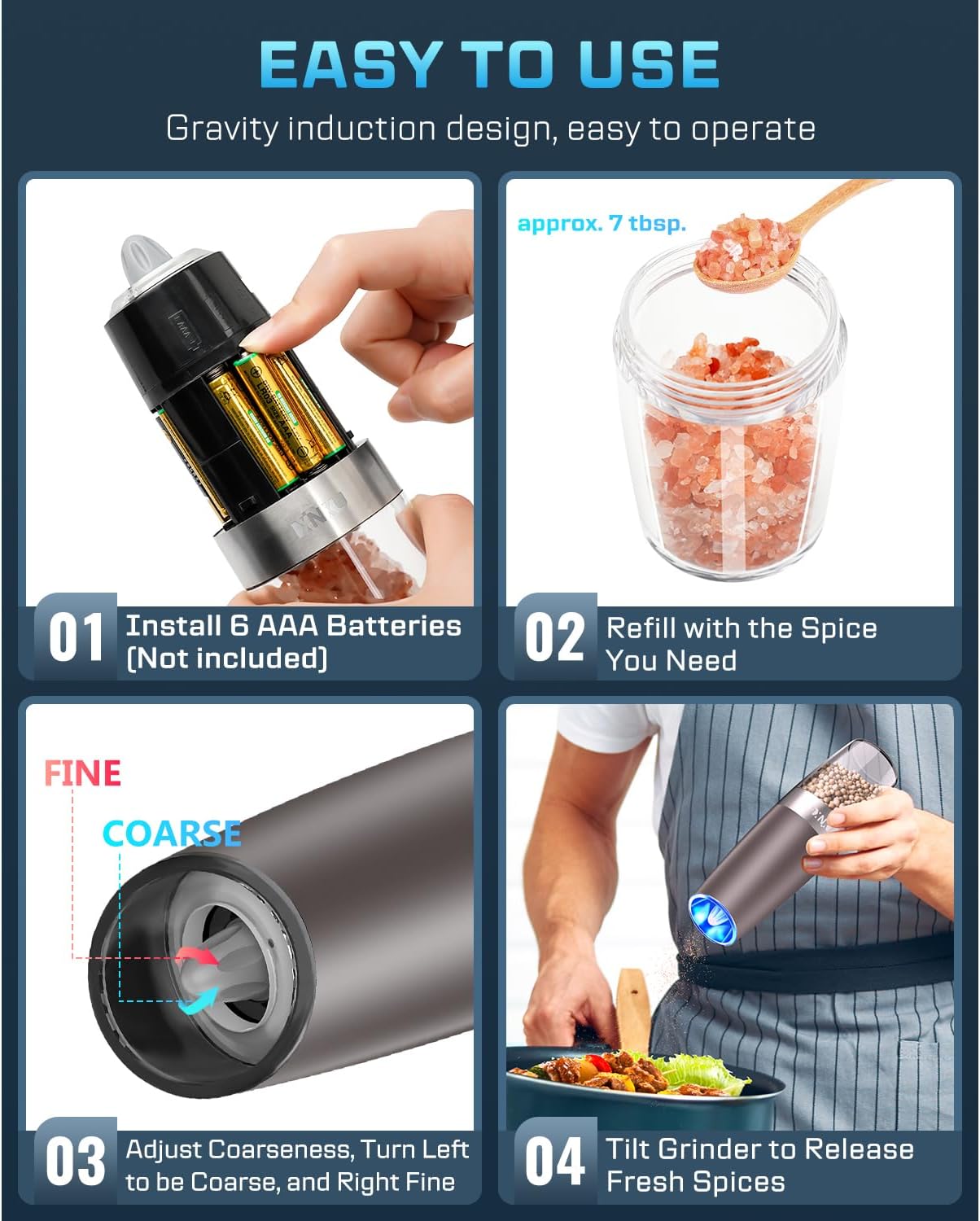 - 【Automatic Operation】Our Electric Pepper and Salt Grinder with Gravity sensor switch, you even needn’t to press a button, Simply flipped the grinder and you will have fresh ground spices, Convenient and funny. Battery powered, each grinder requires 6 AAA batteries (batteries not included, Please prepare batteries in advance).